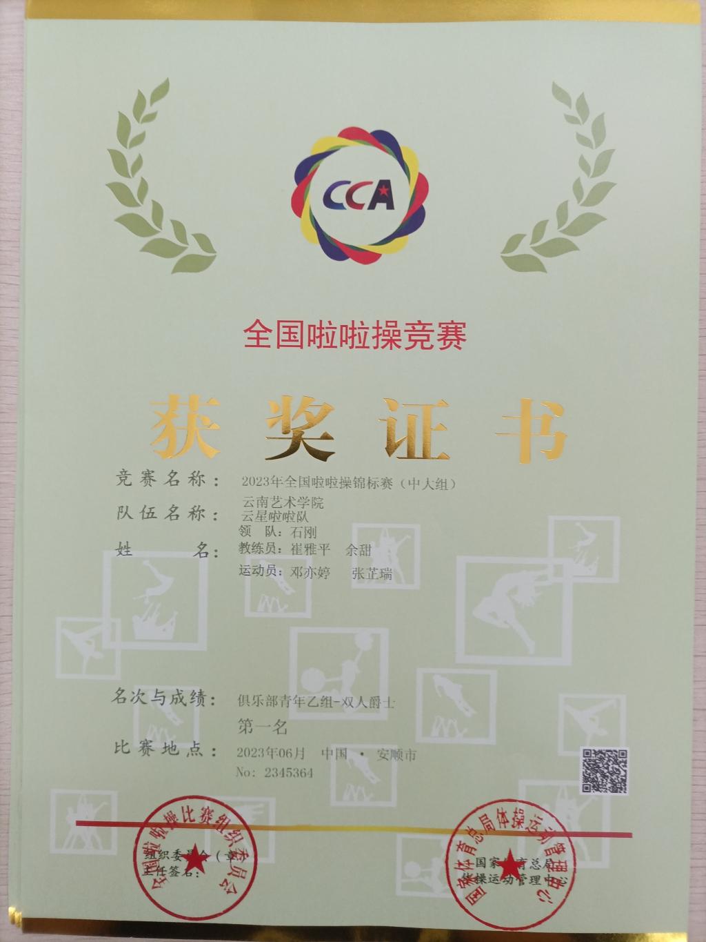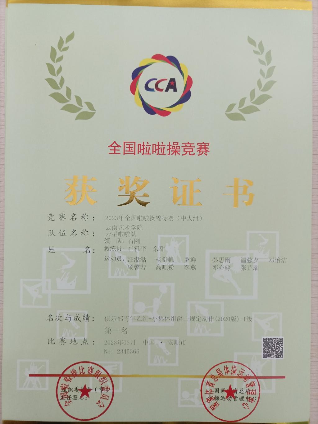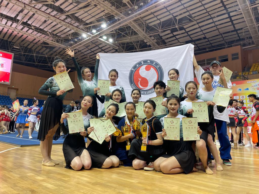 六月骄阳传捷报,全国赛场竞芬芳。我院啦啦操队在2023全国啦啦操锦标赛中喜获佳绩。本次比赛由国家体育总局体操运动管理中心、中国蹦床与技巧协会主办,于2023年6月2日至8日在贵州省安顺市奥体中心举行。接到比赛通知,学院领导高度重视,由体育教学部主任石刚老师领队,崔雅平、余甜两位老师组队训练、带队参赛。