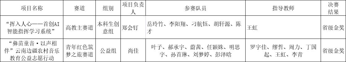 2023年7月25日至26日,第九届云南省“互联网+”大学生创新创业大赛决赛在昆明学院举行,音乐学院“挥入人心——首创AI智能指挥学习系统”(项目负责人:郑会钉,指导教师:王虹)和“彝苗童音·以声相伴——云南边疆农村音乐教育公益志愿行动”(项目负责人:尚佳,指导教师:罗宇佳等)共2个项目经学校初赛、省级复赛和网评遴选并公示,进入决赛,在决赛中分别获得高教主赛道本科创意组金奖和青年红色筑梦之旅赛道公益组金奖。