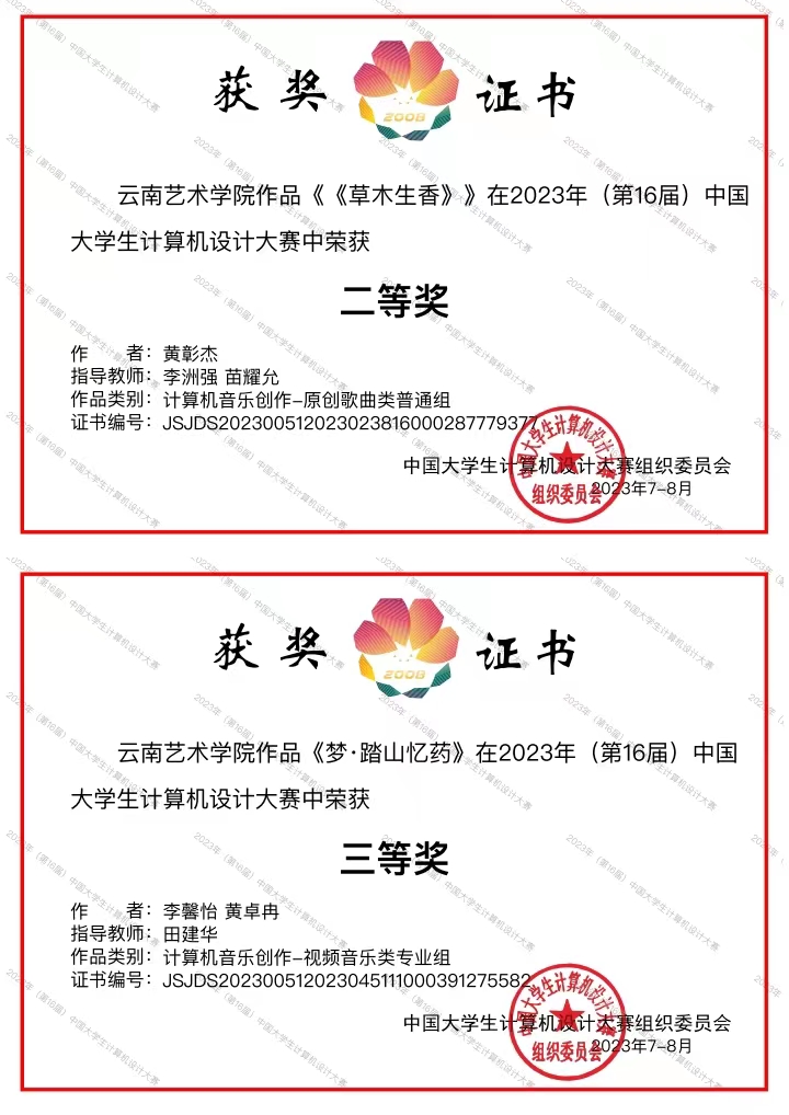 2023年(第16届)中国大学生计算机设计大赛决赛于8月19日开幕、8月21日落幕,该赛事汇集了来自全国各大高校的精英学子,其中计算机音乐创作组由全国各大高校共161件作品进入决赛。买球投注官方网站音乐学院作曲系教师、音乐教育系教师指导的两个作品以云南省一等奖的成绩进入国家级决赛,分别斩获二等奖及三等奖。