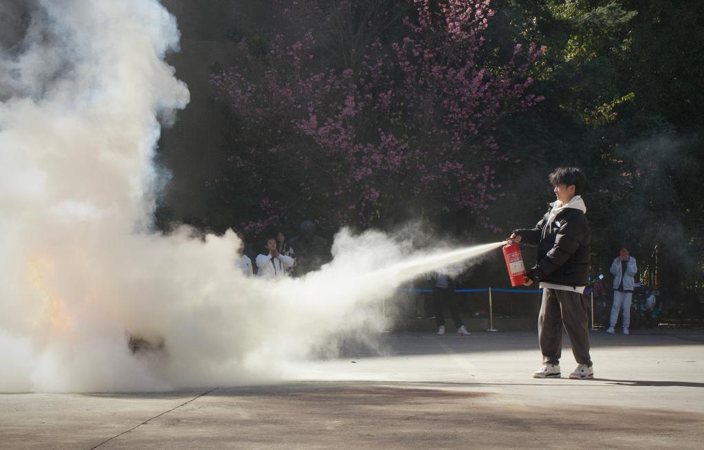 13:30分,全体师生呈半圆形围站在停车场周边,认真观看油盆灭火实战演练。保卫人员、宿管人员、食堂工作人员、教师代表、学生代表轮番上阵,对现场着火点进行灭火实操体验。提、拔、握、压,整套动作准确、规范、标准、连贯,让大家在最短的时间内牢记了手提式干粉灭火器的使用要领,掌握了正确的灭火方法、灭火技巧。