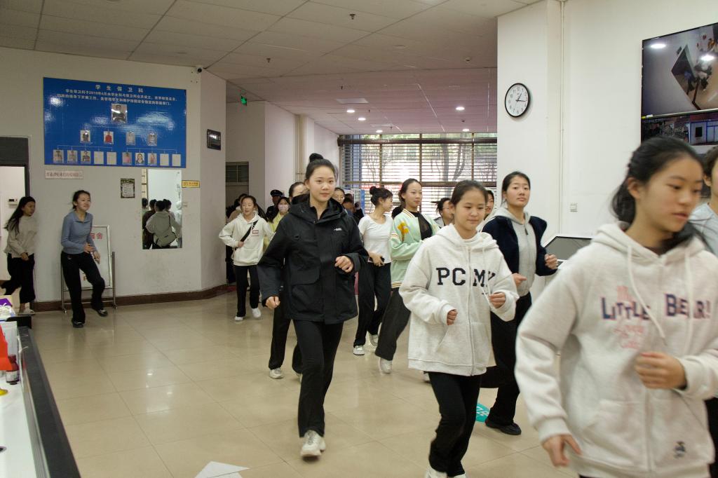 13:10分,随着“演练开始”指令发出,各班主任立即带领学生前往学生宿舍楼。保卫人员在学生宿舍一楼消防监控室门口引导各班级学生分批有序进入相应楼层,1—9楼各安排一名宿管员和班主任负责负责留守在指定楼层楼梯口。听到“哨声”响后,学生从九楼依次往下开始疏散。疏散出来的人员迅速撤离至篮球场指定位置集中。人员全部疏散完毕后,各班主任以班级为单位整队集合并清点人数上报,杜永正老师向校领导报告全程疏散伤亡情况。整个疏散演练过程紧张、快速、安全、有序,用时4分30秒,达到了预期效果。