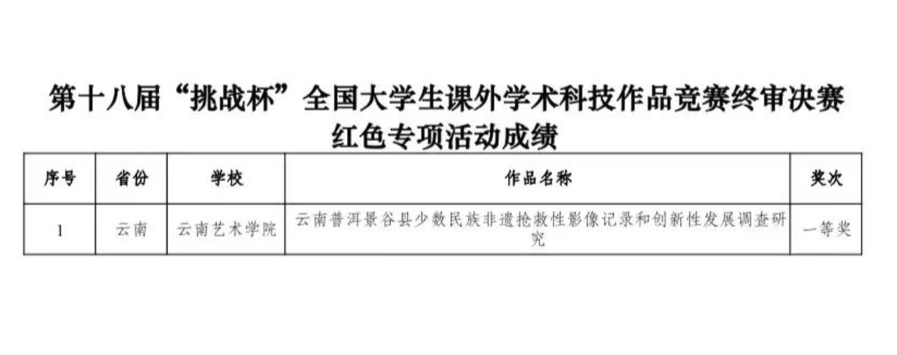 买球影视学院《云南省普洱景谷县少数民族非遗抢救性影像记录和创新性发展调查研究》作为云南省唯一入围“挑战杯”红色专项活动终审决赛的参赛项目,荣获第十八届“挑战杯”全国大学生课外学术科技作品竞赛红色专项活动一等奖,这是学校在“挑战杯”竟赛中的历史最好成绩,也是目前云南省在“挑战杯”红色专项活动中取得的最好成绩。