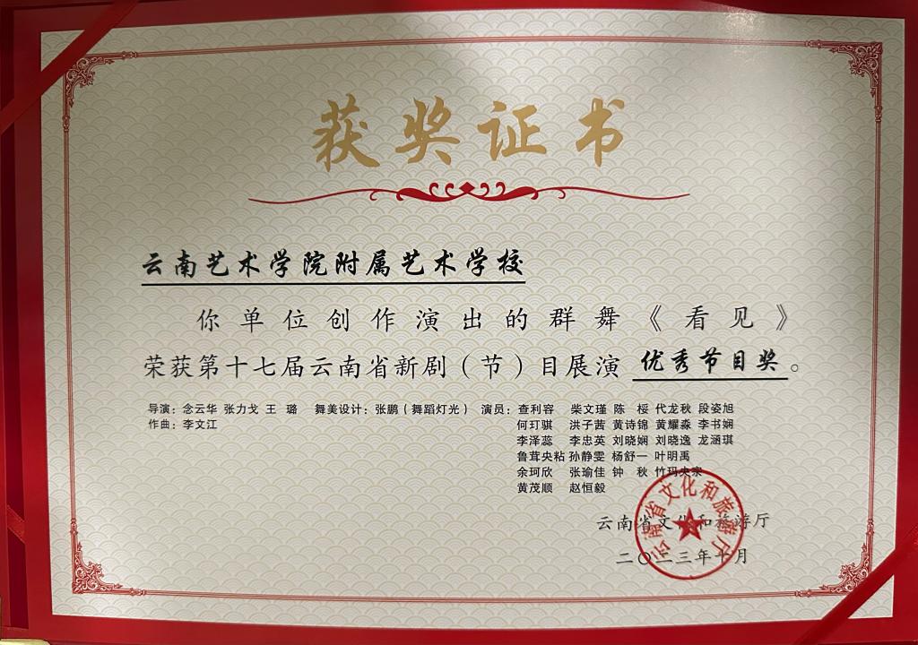 买球原创舞蹈作品《看见》《春耕》,经过专家组严格评审,成功入围本次展演。藏族群舞《看见》运用了写意和写实的手法相结合,以盲人的母亲为视角,传递了母爱的伟大。哈尼族群舞《春耕》则是以哈尼梯田为劳作背景,体现了人与自然的和谐发展,买球学生精彩的舞台呈现得到社会各界的一致好评。本次展演舞蹈类节目仅有4个作品获奖,其中买球藏族群舞《看见》在本次展演中荣获“优秀节目奖”,并受邀于10月27日晚参加本届展演的颁奖典礼。