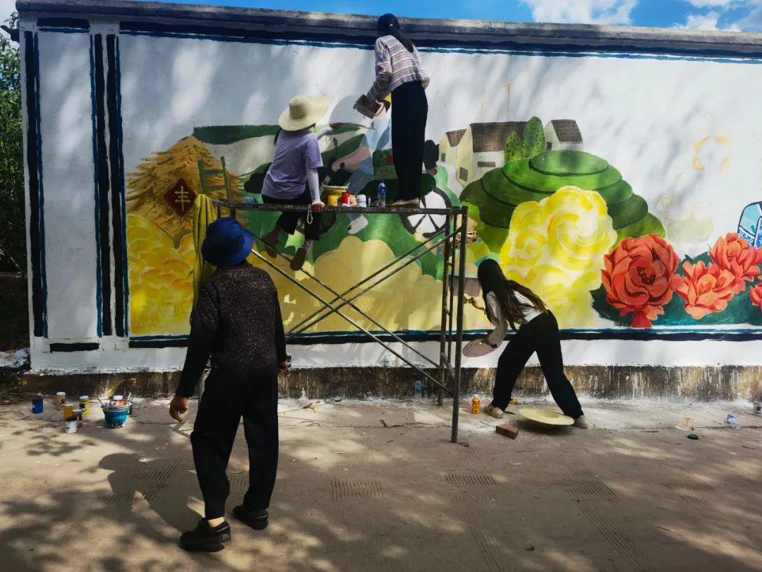 结合乡村振兴工作任务和美丽乡村建设需要,龚栋强利用学校资源,组织了买球投注官方网站的40名师生开展“设计新生活 彩绘自由村”活动,围绕党的建设、民族团结、生态文明等主题进行墙壁彩绘创作,为自由村创作20余幅墙体彩绘,以不同的书法字体创作对联10余幅点缀自由村进村道路两侧。