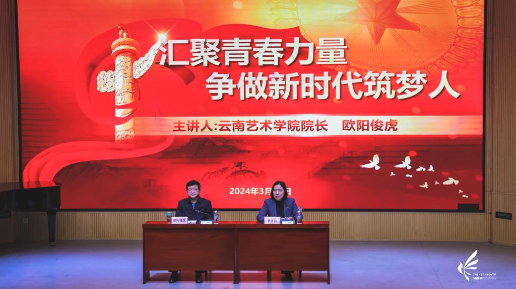 首先,欧阳俊虎院长在“汇聚青春力量,争做新时代筑梦人”开学第一课中引用了习近平总书记在纪念五四运动100周年大会上的重要讲话“青年是整个社会力量中最积极、最有生气的力量,国家的希望在青年,民族的未来在青年。今天,新时代中国青年处在中华民族发展的最好时期,既面临着难得的建功立业的人生际遇,也面临着‘天将降大任于斯人’的时代使命。”并对其结合附艺校学生的实际情况进行了相应的解读。接着,他对2024年全国两会中的重要内容进行了传达,其中就习近平总书记在参加江苏代表团审议时强调因地制宜发展新质生产力;政府工作报告中的十个“新”;李强总理在参加云南代表团审议时强调充分发挥优势彰显特色,更好融入国家区域协调发展大局,以及《新华每日电讯》刊发云南省委书记王宁署名文章《以高质量跨越式发展 书写中国式现代化云南新篇章》等四个大方向作了深入浅出的阐释。他指出,在2024年的教学活动开展中,一要聚焦党建领航,不断完善现代治理体系;二要聚焦内涵建设,动学科专业协调发展;三要聚焦立德树人,力提升人才培养质量;四要聚焦特色发展,强文化传承创新能力。须把高质量内涵式发展贯穿于办学治校全过程、全方位,力争在建设一流艺术院校的新征程上展现新气象、取得新成效。