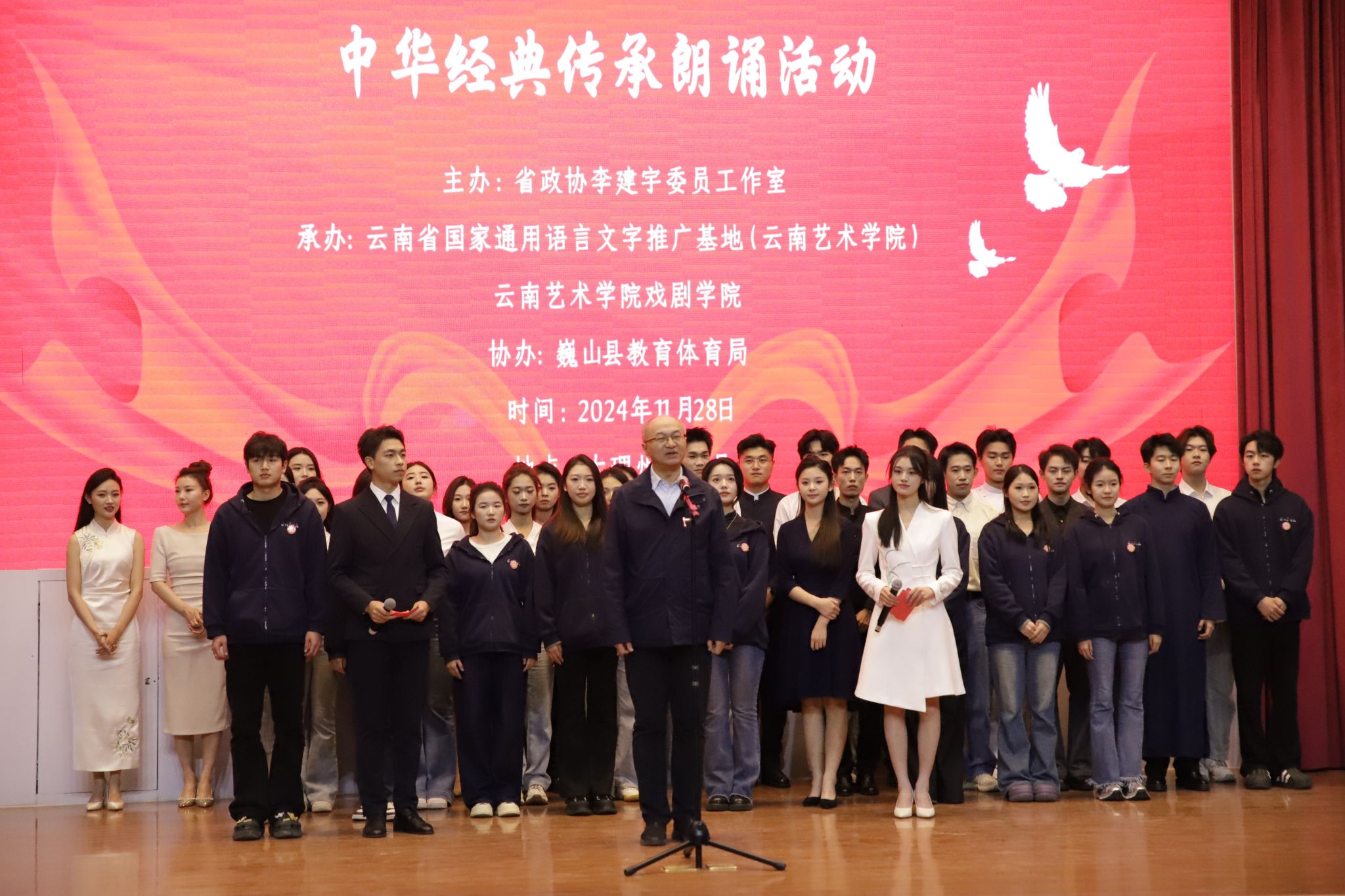 本次活动由省政协李建宇委员工作室主办,云南省国家通用语言文字推广基地(买球投注官方网站)、买球投注官方网站戏剧学院承办,巍山县教体局协办。买球戏剧学院播音系42名师生组成推普志愿服务队,以一个讲座、一堂公开课、一场展演“三个一”开展推普活动。