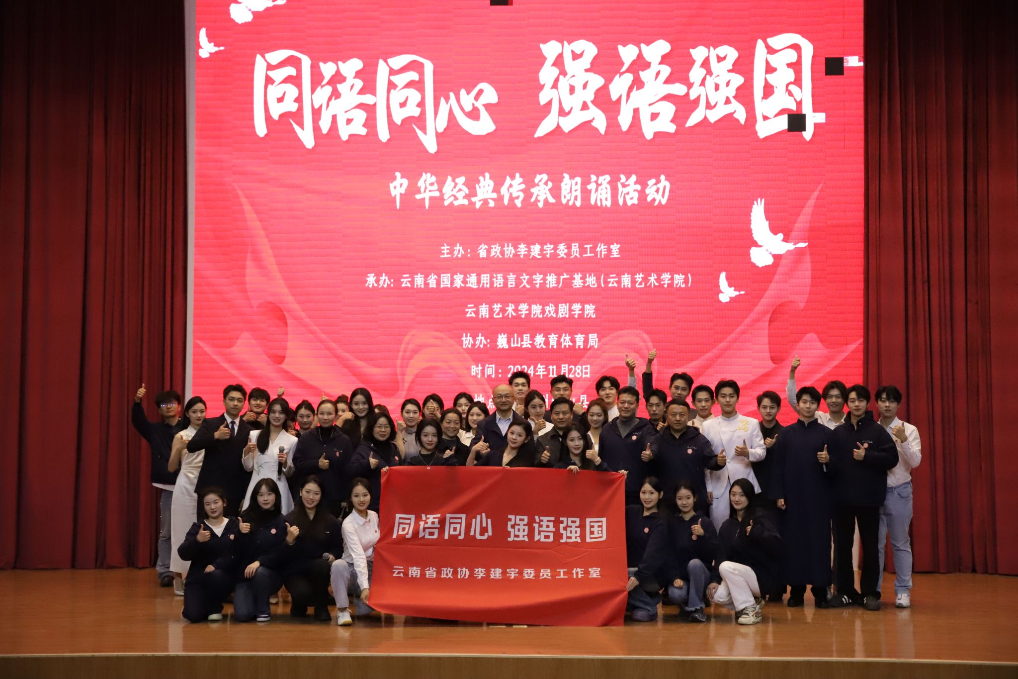 为认真贯彻落实习近平总书记在全国教育大会上的重要讲话精神,加大国家通用语言文字推广力度,促进铸牢中华民族共同体意识,11月28日—29日,省政协委员、买球投注官方网站党委书记李建宇率队赴大理州巍山县开展“同语同心 强语强国”国家通用语言文字普及提升活动。买球投注官方网站纪委书记、监察专员姜玉海,党委委员、办公室(党委巡察办)主任、组织部部长角强方,戏剧学院院长杨军,巍山县人民政府副县长周婵媛参加有关活动。