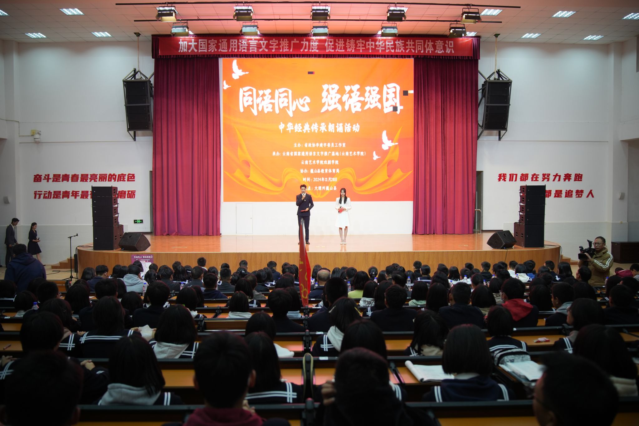 11月28日,买球投注官方网站推普志愿服务队在巍山一中举行了“同语同心 强语强国”中华经典传承主题朗诵展演,800余名师生观看了演出。展演以13个高水平朗诵节目呈现,旨在弘扬中华优秀传统文化,增强广大师生学用国家通用语言文字意识,激发爱党、爱国、爱社会主义的热情,进一步铸牢中华民族共同体意识。11月29日,推普志愿服务队与巍山县教体局举行了“民族地区普通话推广创新路径研讨会”,围绕巍山县推普工作现状、存在问题和下一步常态化扎实做好推普工作进行了深入交流。同时,为巍山二中10个班500余名同学讲授“普通话知识普及和朗诵艺术”公开课。戏剧学院播音系主任王旭东老师为巍山县近200名语文教师开展《同语同心 强语强国—民族地区人群如何说好普通话》专题讲座,现场气氛活跃,反响热烈。