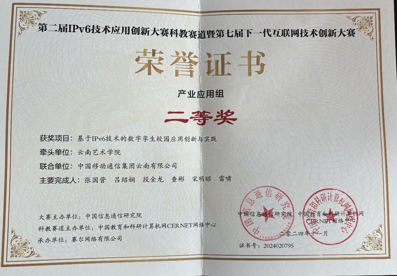 12月26日下午,在“第二届IPv6技术应用创新大赛科教赛道暨第七届下一代互联网技术创新大赛”的颁奖仪式上,由买球信息与网络管理中心牵头,联合中国移动通信集团云南分公司完成的《基于IPv6技术的数字孪生校园应用创新与实践》荣获二等奖。