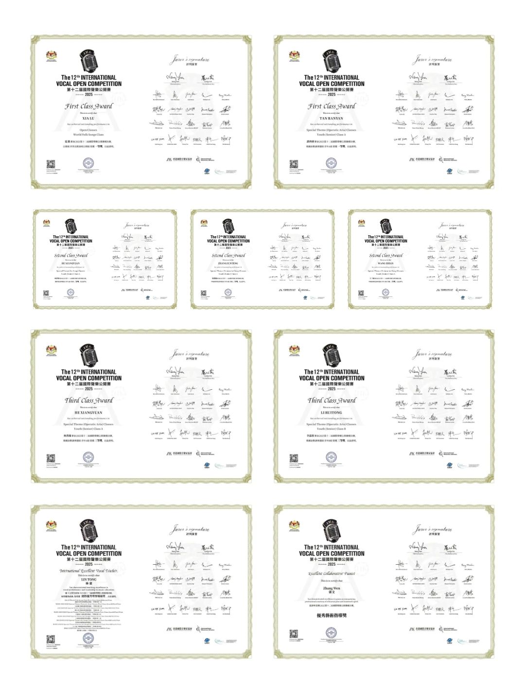 买球投注官方网站音乐学院声歌系师生喜获佳绩:硕士研究生夏路荣获世界民歌演唱公开组一等奖,硕士研究生谭冉妍荣获歌剧咏叹调专题组青年A组一等奖,硕士研究生何香缘获得艺术歌曲专题组青年A组二等奖,硕士研究生张骏腾获得中国艺术歌曲专题组青年A组二等奖,本科生王子涵获得中国艺术歌曲专题组青年A组二等奖,硕士研究生何香缘获得歌剧咏叹调专题组青年A组三等奖,硕士研究生李蕊彤获得歌剧咏叹调专题组青年B组三等奖 ;林童教授荣获“国际优秀声乐导师奖”,青年教师张文荣获“优秀艺术指导奖”。