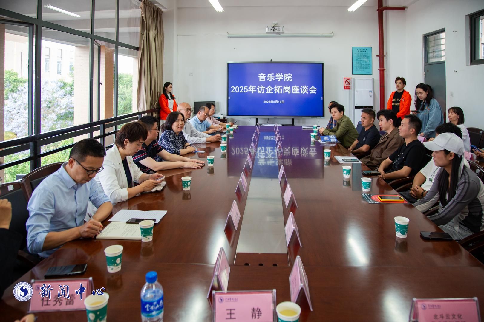 现场招聘会结束后,学校党委副书记李彦萍,党委委员、党委统战部部长李攀通,学生处副处长邵清友,以及音乐学院党政领导、师生代表与用人单位代表在音乐学院A301会议室举行访企拓岗座谈会。会议上校企双方就推进学科专业结构调整、提升人才培养质量,增强与社会需求的匹配度等问题进行了深入探讨,对下一步与各企业在共建实习实践基地、联合开展项目等领域开展深层次合作,实现资源共享、互利共赢达成共识。