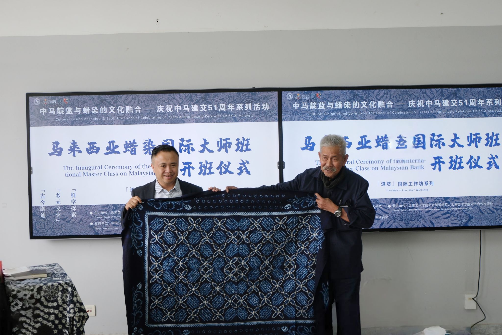 开班仪式的最后,纳吉布教授赠予了马来西亚蜡染纹样图册,蒋锋副院长则回赠了代表云南非遗的扎染作品。这不仅是文化友谊的象征,更是中马文明互鉴的生动体现。