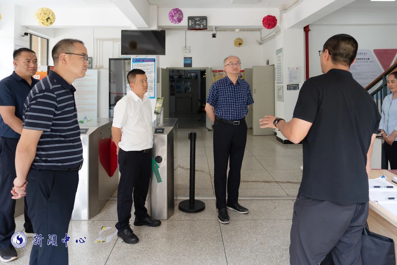 李建宇一行先后到学校出入口、学生宿舍、二期建设指挥部、图书馆等重点区域,通过查、看、问、记相结合的形式,对暑期校园安全工作开展细致检查。检查内容覆盖暑期留校学生管理、消防安全、交通安全、治安防范、实验室安全、食品安全、用电安全、防汛防灾、施工安全、值班值守以及网络安全等关键环节。
