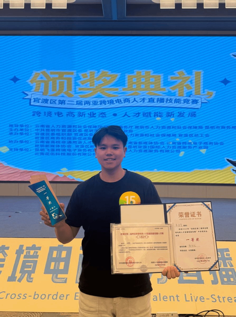 10月17日,由云南省人力资源和社会保障厅、云南省商务厅、昆明市人力资源和社会保障局、昆明市商务局指导的官渡区对外贸易产业跨境电商人才活动暨第二届两亚跨境电商人才直播技能竞赛,在云南(昆明官渡)国际人力资源服务产业园圆满落下帷幕。买球艺术管理学院2026届毕业生朱泽荃以出色表现荣获第一名,学校招生与就业处获本次比赛优秀组织奖。赛后,朱泽荃将与其他优秀选手一起入选官渡区南亚东南亚跨境电商人才库,获得持续的职业发展支持。这一机制不仅为获奖选手提供了更广阔的发展平台,也为区域经济发展注入了新活力。