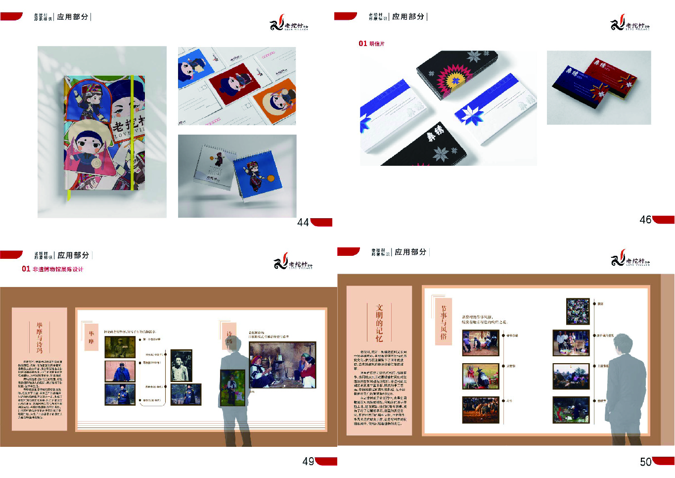 具体设计方面,依据设计清单,小组成员完成了包括入村精神堡垒小品设计、入村花坛刺绣解说牌设计、入村沿途墙绘设计等多处任务目标,为当地设计绘制了IP形象,并以此延展出各类文创、包装设计方案,形成了基础的村指示系统,搭建了老挖村的非遗品牌形象。过程中,石林风景管理局昂贵老师、老挖村委会有关领导对设计提出了大量宝贵意见、建议,也给设计团队提供了丰富的在地设计经验。基本形成了一套以石林老挖村彝族撒尼刺绣纹样为线索,逐步介绍村落文化体系、引出村落地缘优势的乡村振兴品牌设计思路。