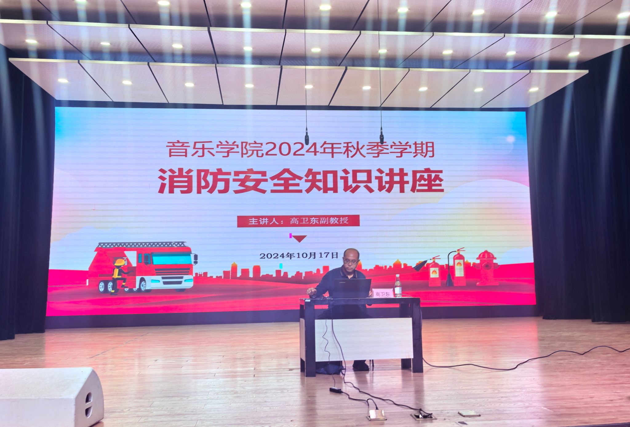 为普及消防安全知识,增强学生消防安全意识,2024年10月17日,音乐学院举办了消防安全知识讲座,由高卫东副教授主讲,音乐学院学生管理科冯梦瑶主持,学院300余名学生及辅导员参加。