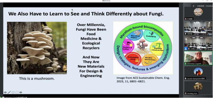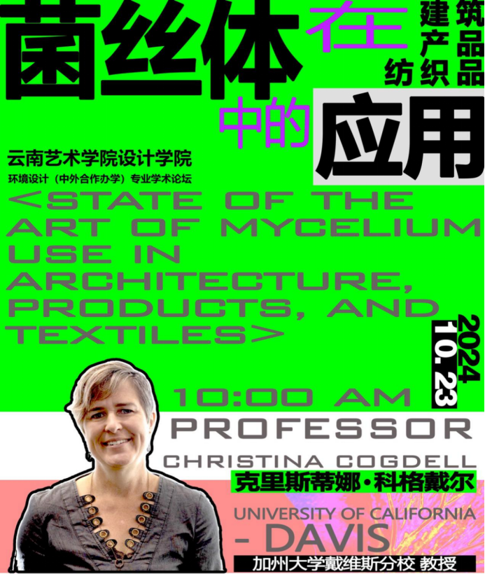 2024年11月4日-26日,加州大学戴维斯分校设计系CHRISTINA COGDELL(克里斯蒂娜 科格戴尔)教授受买球邀请到学校讲学。在为期近一个月的教学中,克里斯蒂娜·科格戴尔教授将聚焦环境设计领域前沿科技,以跨学科的学术视野,向设计学院环境设计专业本科学生展示加州大学戴维斯分校设计系在“设计+自然科学”方面创新探索的最新成就。克里斯蒂娜·科格戴尔教授在“菌丝体在建筑、产品和纺织品中的应用”专题讲座中阐述了菌丝体作为新兴生物材料的科学原理,强调其在应对全球气候变化与推动可持续发展方面的重要作用并详细介绍了菌丝体在建筑、产品及纺织行业应用中的广泛潜力,其卓越的保温、阻燃、防水性能以及对环境影响的极低程度,使之成为替代传统材料的优选,揭示了跨领域应用的无限可能。