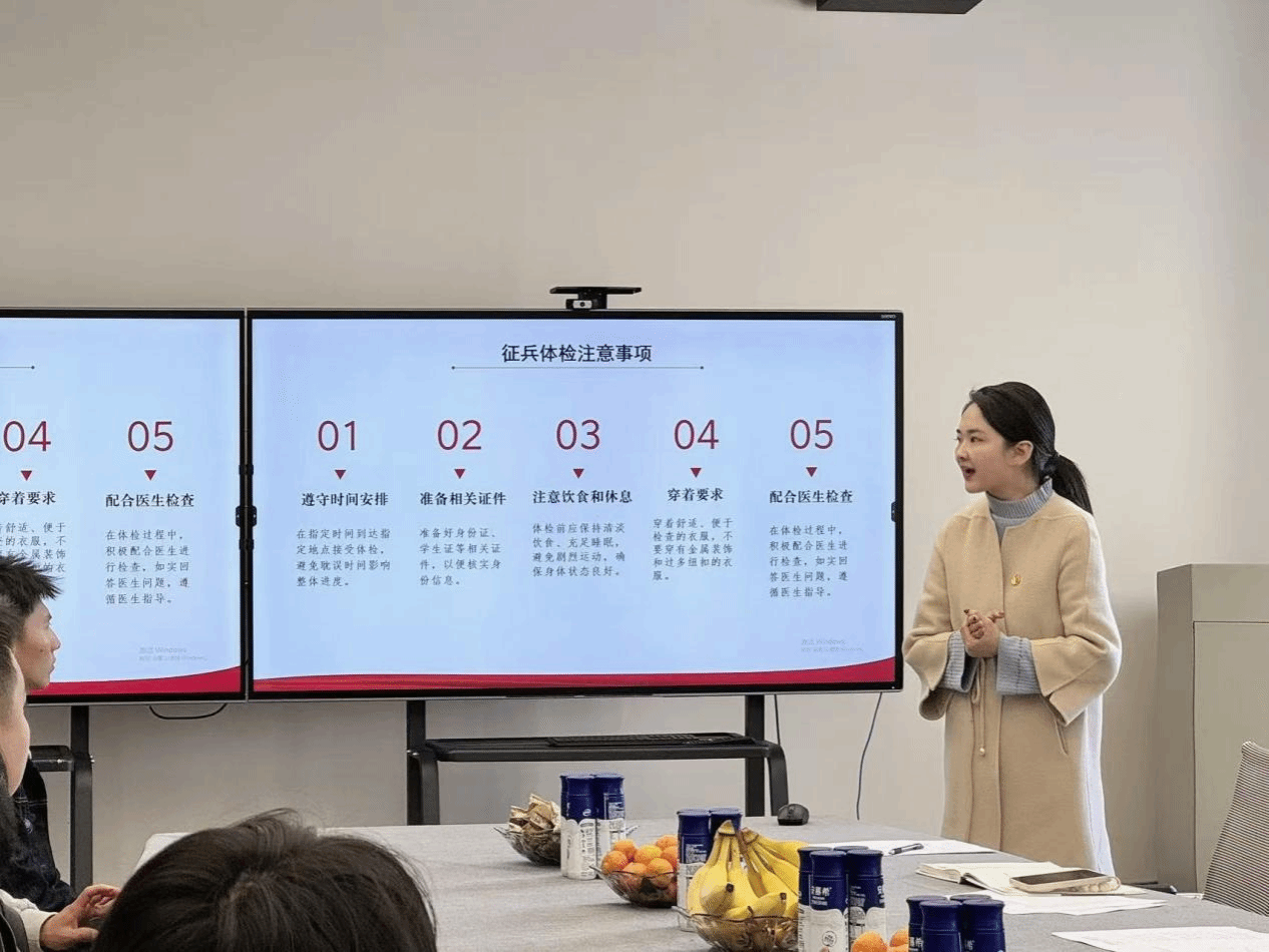随后负责国防工作的辅导员刘宇奇老师对2025年春季征兵政策进行了详细解读,详细介绍了征兵的条件、流程、待遇以及国家对于大学生士兵的各项优惠政策,鼓励符合条件的同学们积极报名参军,为国家的国防事业贡献自己的力量。