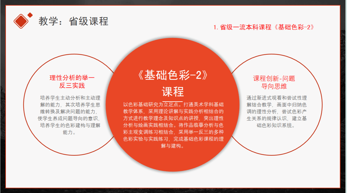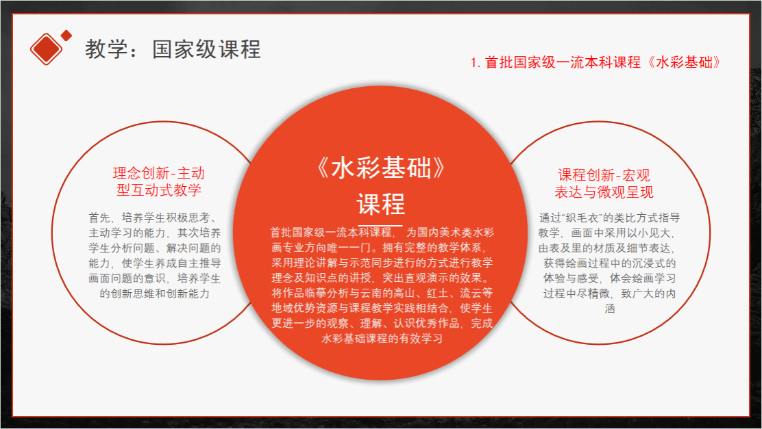 国家级一流课程1门,省级一流课程1门,省级教师教学创新大赛三等奖1项。获国家艺术基金美术创作项目1项,国家艺术基金青年创作项目2项、云南省艺术基金青年创作项目2项、买球投注官方网站科研项目1项、精品网络在线课程1门、慕课出海课程1门。近三年国家级、省级展览入选获奖100余项。其中,十四届全国美展教师7件作品入选。