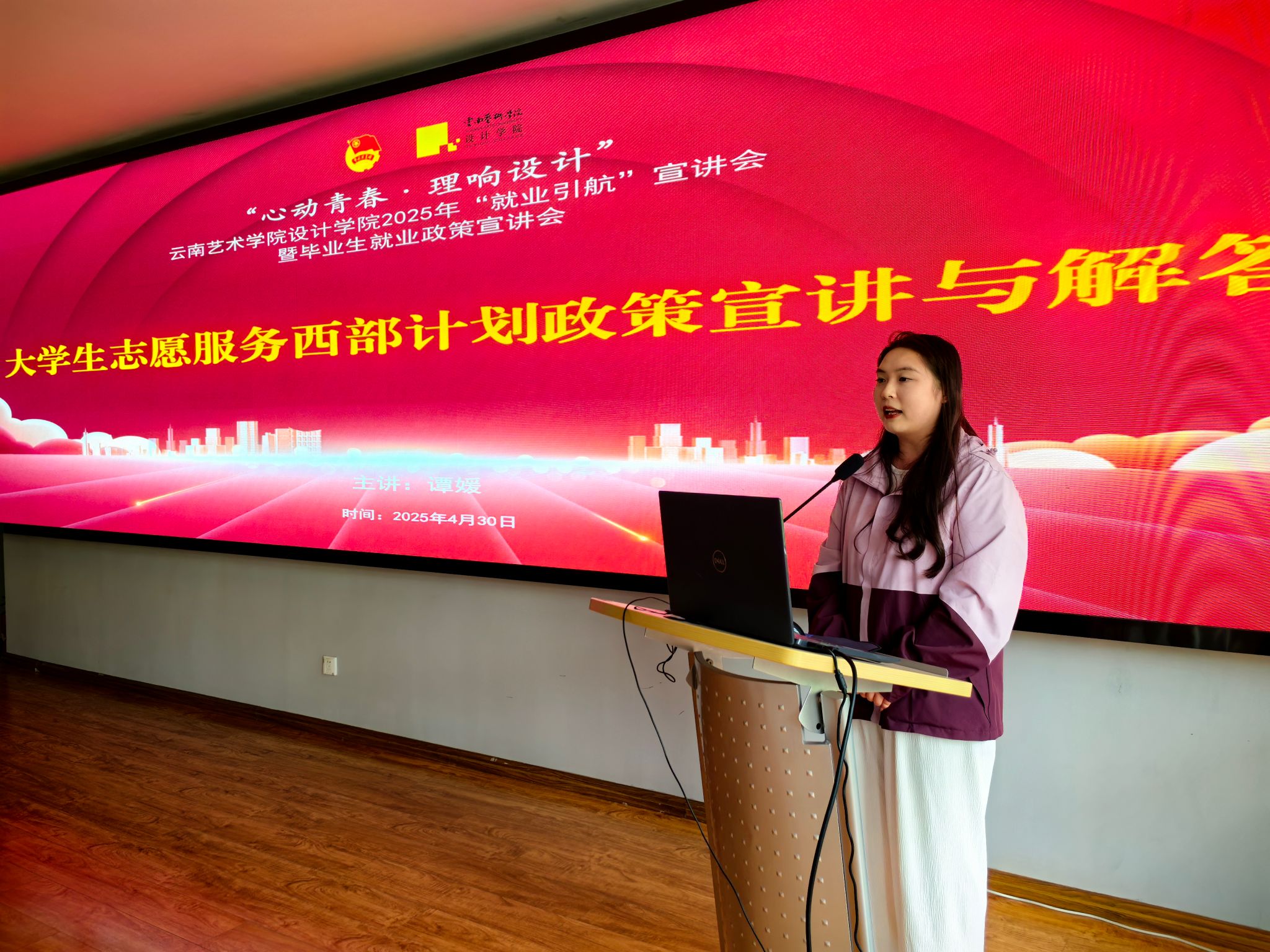 为进一步做好2025年西部计划招募宣传工作,引导和鼓励广大毕业生到基层去,主动融入国家和云南发展大局,设计学院于4月30日下午在202会议室开展“心动青春·理响设计”设计学院2025年“就业引航”宣讲会暨毕业生就业政策宣讲会。设计学院党委副书记欧阳继梅、全体辅导员、各年级学生代表参加宣讲会,党委委员、团委书记王瑛主持。