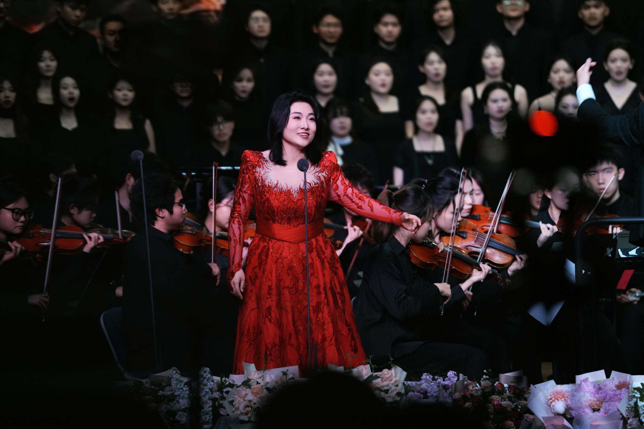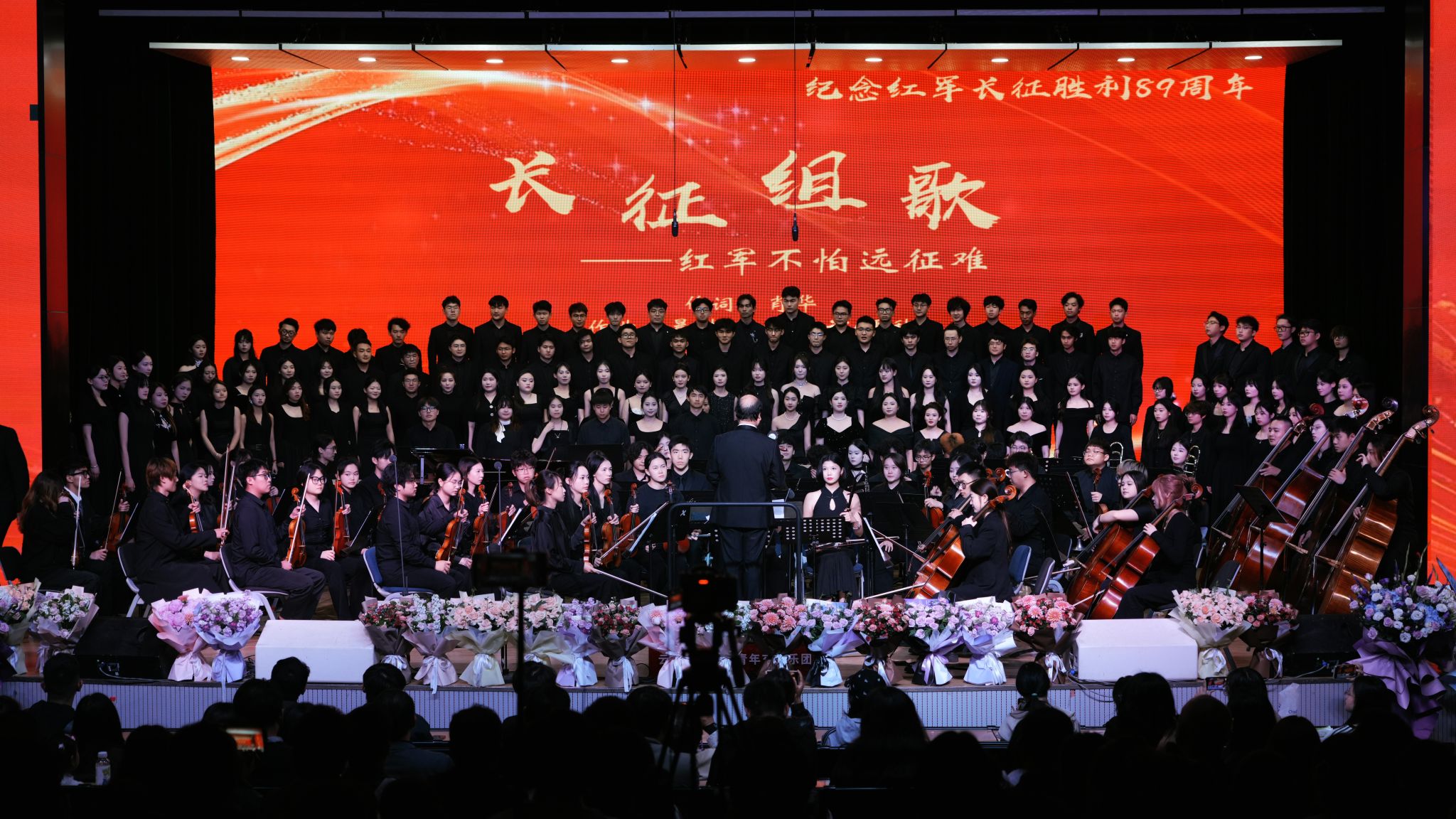 下半场,由合唱系教师张红彬以极具感染力的指挥风范,携手合唱系、民族声乐系、声乐歌剧系的尹伟、杨丽霞、刘英梓、李婷婷、罗聪鹏、杨扩以及薛文静共7位教师实力领唱,用歌声深情诉说长征故事;买球投注官方网站青年交响乐团以磅礴演奏为演出注入强大艺术张力;郝悦晴、王鑫浩两位同学通过铿锵的朗诵,丰富了作品的艺术层次。2021、2022级合唱班113名同学以饱满热情与专业素养,共同演绎中国经典合唱声乐套曲《长征组歌》。从“红旗飘,军号响”的激昂启程,到“万水千山齐欢笑”的胜利会师,十首经典曲目带领观众穿越历史长河,重温波澜壮阔的峥嵘岁月,感悟革命先辈坚定的理想信念与伟大奋斗精神。本场音乐会不仅是同学们专业学习成果的集中展示,更是新时代青年学子致敬与传承长征精神的生动实践。