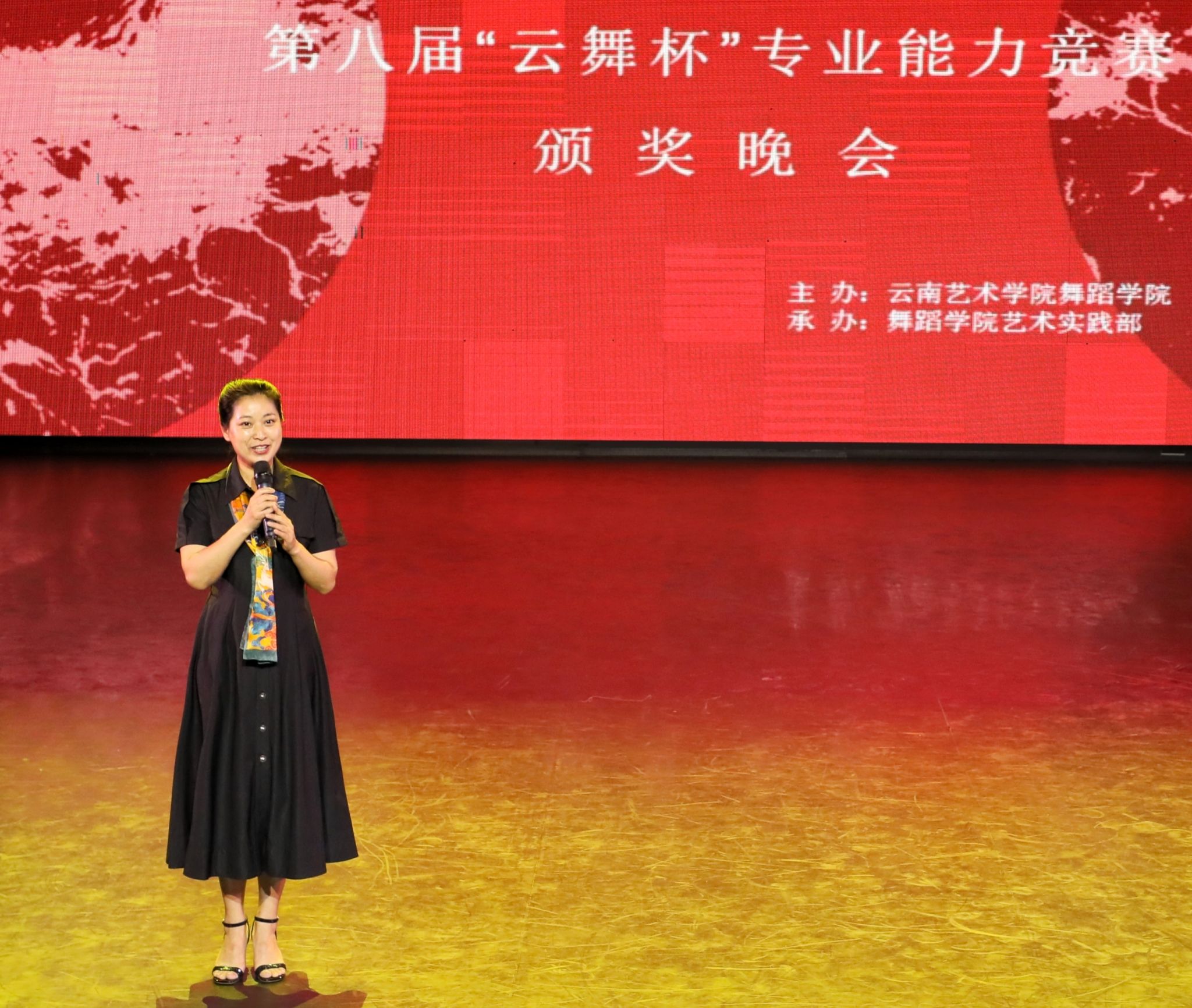 舞蹈学院院长刘丽教授致辞。她提出“云舞杯”专业技能竞赛作为舞蹈学院研究生与本科生拔尖人才培养的举措,深入落实立德树人根本任务,推进“党建+思政+艺术”育人工作,旨在通过建构从课程教学到学术训练和舞台创新实践的有效路径,不断推动学科专业建设,提高人才培养质量,向社会输送具有较高文化修养、专业技能和创新能力的舞蹈专业人才。同时,希望借此机会能与云南舞蹈界各位专家共同探讨云南舞蹈创新人才的培养,努力推动云南舞蹈事业的长足发展。