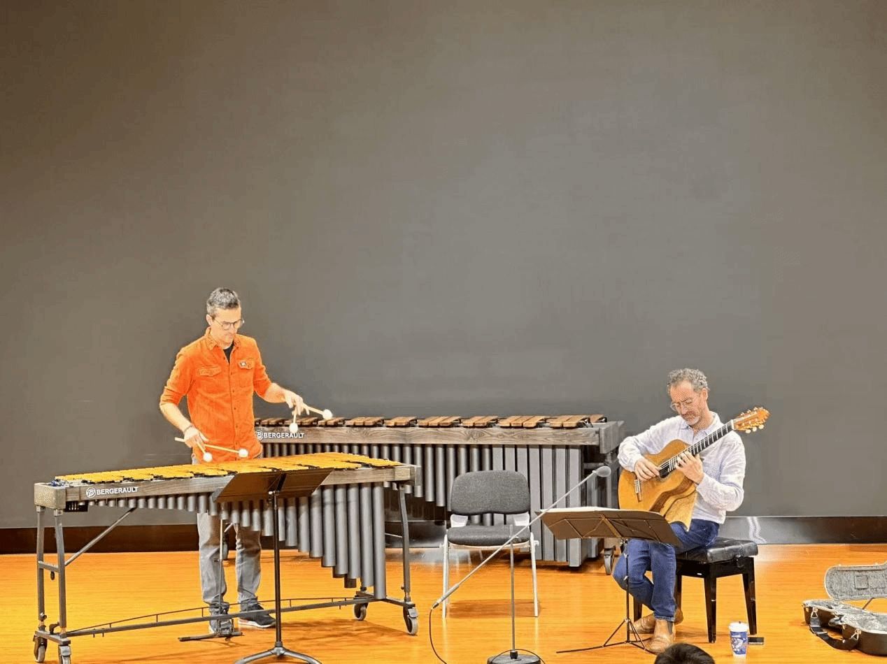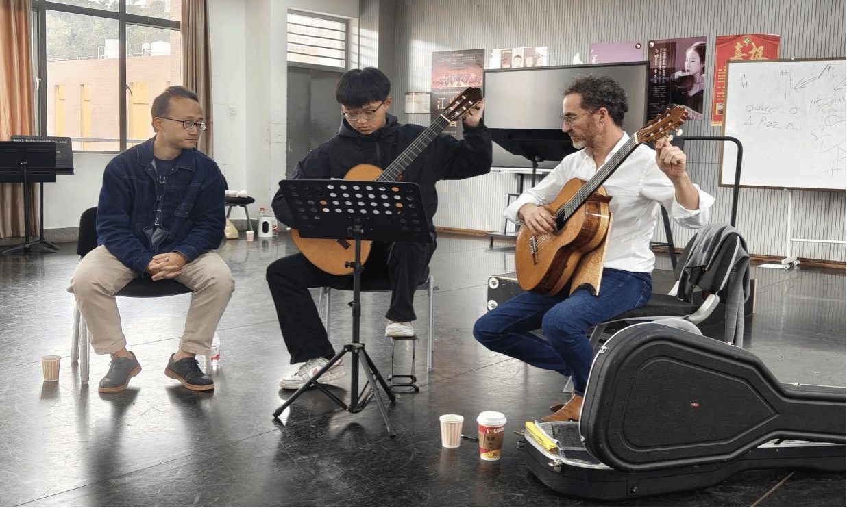 2025年10月8日至9日,经过前期筹备,法国著名古典吉他演奏家雷米·朱赛尔姆(Rémi Jousselme)和打击乐演奏家雷诺·德特(Renaud Detruit)到买球投注官方网站音乐学院开展学术交流与讲座。