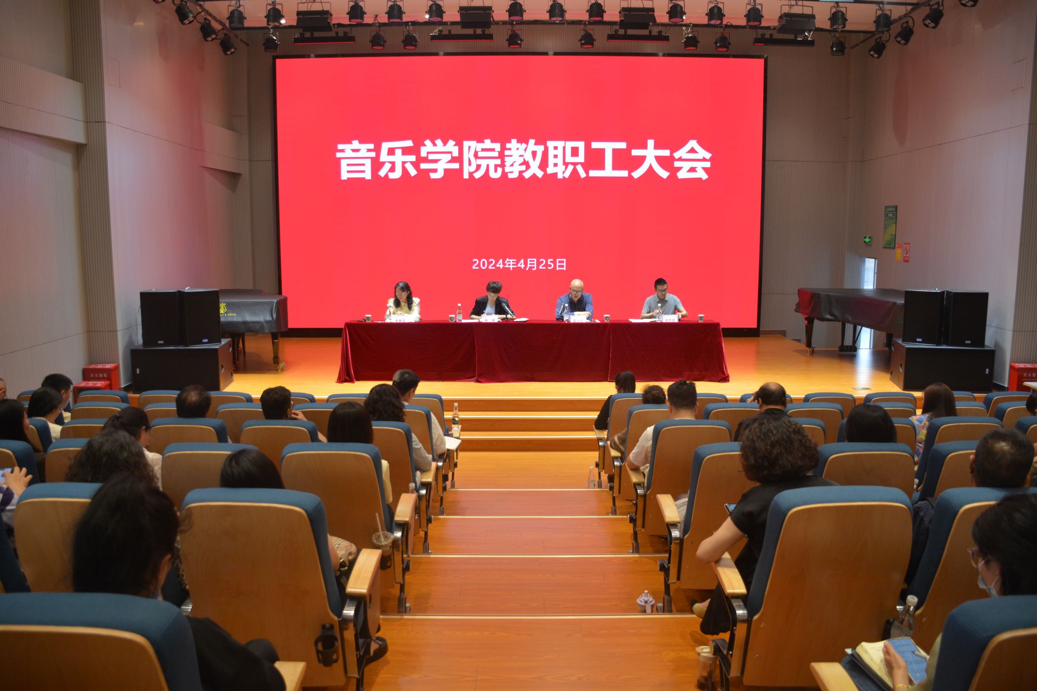 2024年4月25日13:00,音乐学院在B403音乐厅召开教职工大会。音乐学院全体教职工参加会议,会议由音乐学院党总支副书记、院长林林主持。
