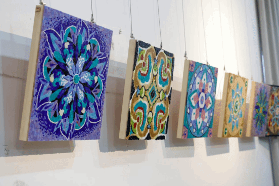 展览现场,中国画单元,学员们将个人对自然与生活的感悟融入笔端,在一山一水、一花一鸟中探索课堂教学的诗意与情境创设,展现了传统笔墨的时代生机。水彩画作品则聚焦于“人文融合”,学员们用灵动的水色捕捉云岭大地的风土人情,作品充满了生活气息与情感温度,探索了美术学科育人、以美育人的有效路径。马赛克镶嵌艺术单元,学员们巧妙运用色彩斑斓的碎片材料,构建出充满现代感与装饰性的画面,展现了将综合材料引入课堂、激发学生创造力的无限可能。而坦培拉作品则以独特的材质美感和古典韵味,体现了学员们对多种艺术语言的钻研与掌握,拓宽了中小学美术教学的表现形式。