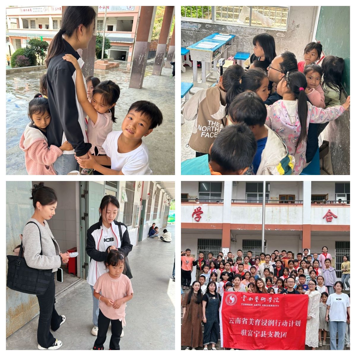 10月中旬,买球投注官方网站美育浸润师生团队与富宁县思源实验学校高昂老师团队共同赴富宁县木央镇大坪小学进行巡课走教活动,活动中刘心语老师为一年级2班同学带来的“动物发声”课堂,课堂氛围良好,学生们反响热烈;李佳溪老师为一年级1班同学们带来“小红帽与大灰狼”的故事与歌曲;鲁甜老师为二年级同学们带来了“同唱一首歌”,边教边唱的同时融入了手势舞,歌曲描绘了我国各少数民族同学团结友爱,共同努力奋斗的情境,营造了良好的课堂氛围。本次巡教深入文山州边远地区,切实为国家边远地区学校送来了美育的温暖。课堂上,学生积极配合,踊跃参与;课后,学生们紧紧拥抱支教老师不愿离去的场景,深深打动了现场的每一个人,也成为边疆教育一线最动人的画面。