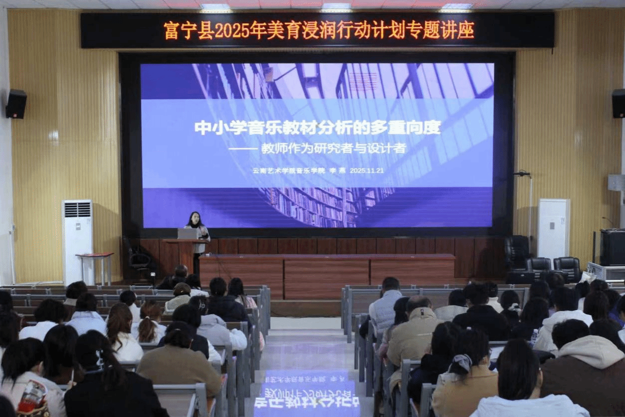 为深入贯彻落实美育浸润行动计划,推动 AI 时代中小学美育高质量发展,11 月 21 日上午,买球投注官方网站音乐学院2025 年秋季学期美育浸润计划专题讲座在富宁县民族中学报告厅举行。全县中小学音乐教师齐聚一堂,共赴这场兼具理论深度与实践价值的美育盛宴。