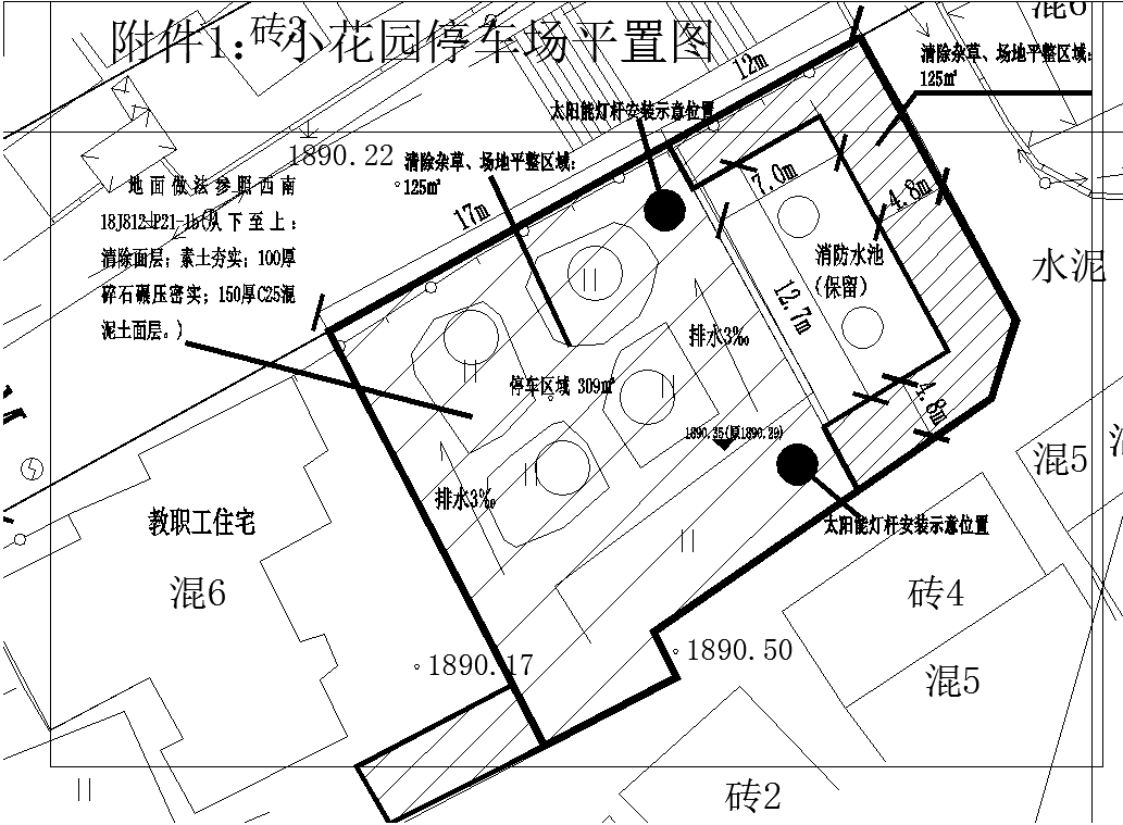 (2)拟改造停车场区域靠住宅一侧:保留长势完好且具有价值的4棵柏树,清除原地面已铺设的碎块地砖,按照要求清除到基层,铺设排水管并预留排水口篦子,混凝土浇筑成为停车场,停车场排水坡度控制在3‰ ,排水方向为道路方向。排水篦子及排水管的铺设根据现场实际情况按照就近原则排入场地附近场地雨水篦子或雨水沟。排水管可按照φ100PVC管预埋。