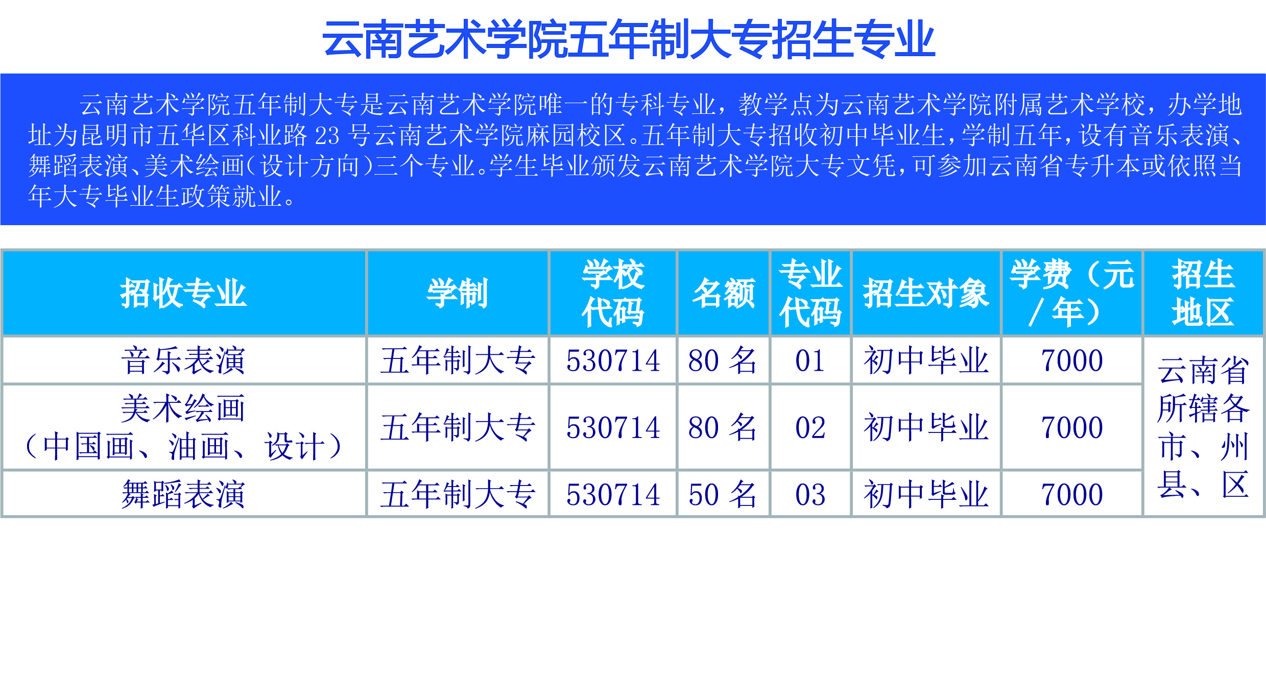 3.五年制大专(高中大专一贯制):五年制大专由买球投注官方网站主办,买球投注官方网站附属艺术学校承办,是买球投注官方网站唯一的专科类专业,现设音乐表演、美术绘画、舞蹈表演三个专业,招收初中毕业生,在附艺校学习五年。成绩合格毕业发买球投注官方网站专科文凭,毕业后可报考专升本继续学习或依照当年专科毕业生政策就业。