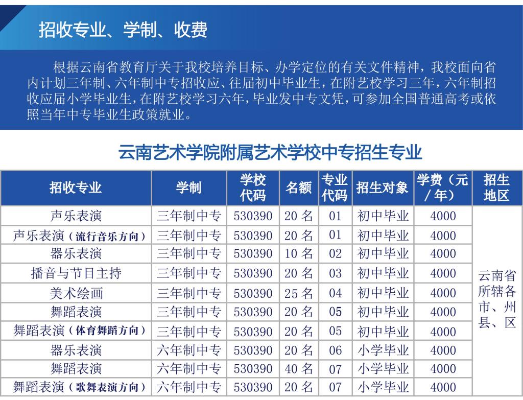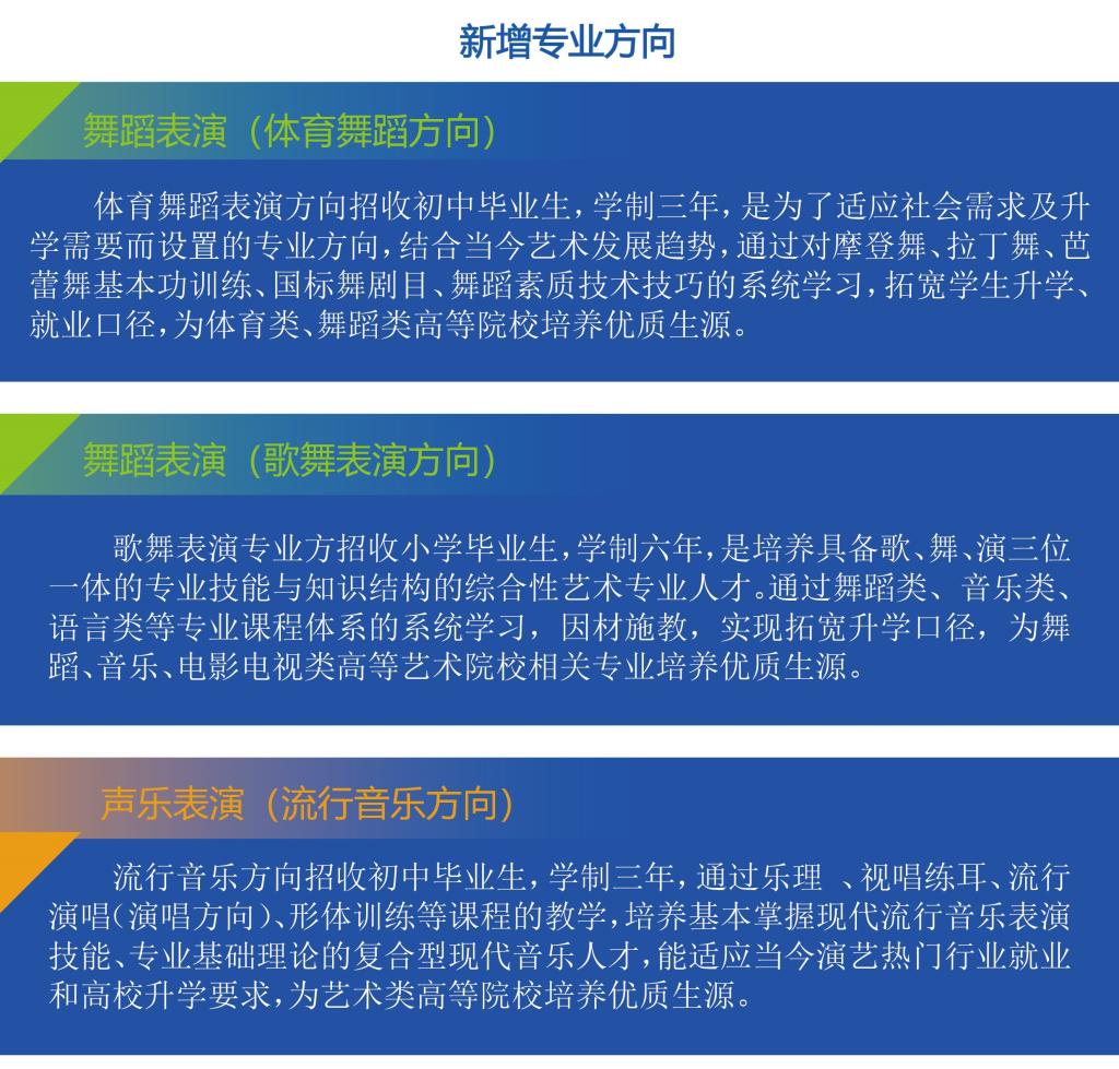 1.三年制中专(高中阶段):招收初中毕业生,在学校学习三年,现设有声乐表演、声乐表演(流行音乐方向)、器乐表演、播音与节目主持、舞蹈表演、舞蹈表演(体育舞蹈方向)等专业,文化学习普通高中文科课程(语文、英语、数学、历史、政治、地理),毕业后发中专文凭,参加全国普通高考或依照当年中专毕业生政策就业。