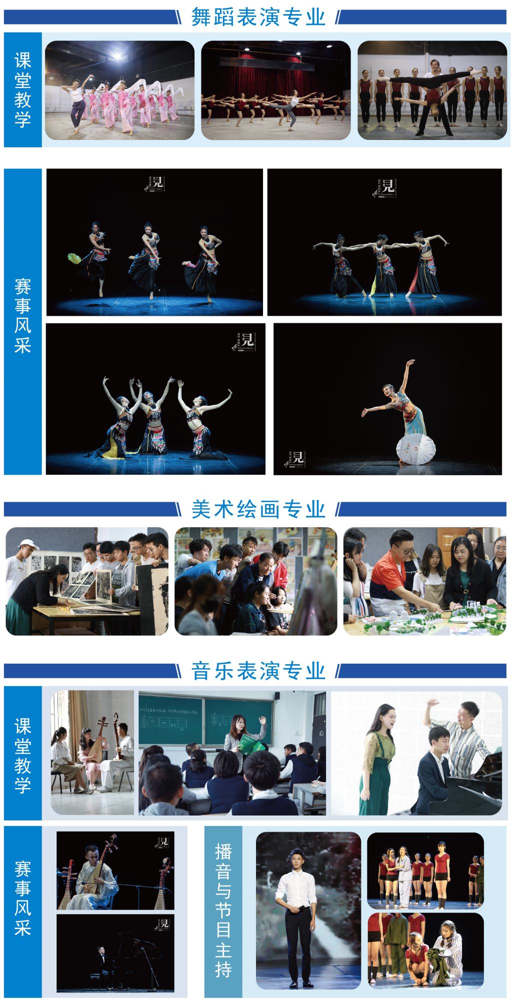 学校现设音乐表演(声乐表演、器乐表演)、美术绘画(绘画方向、设计方向)、舞蹈表演、播音与节目主持四个专业。办学层次分别为: