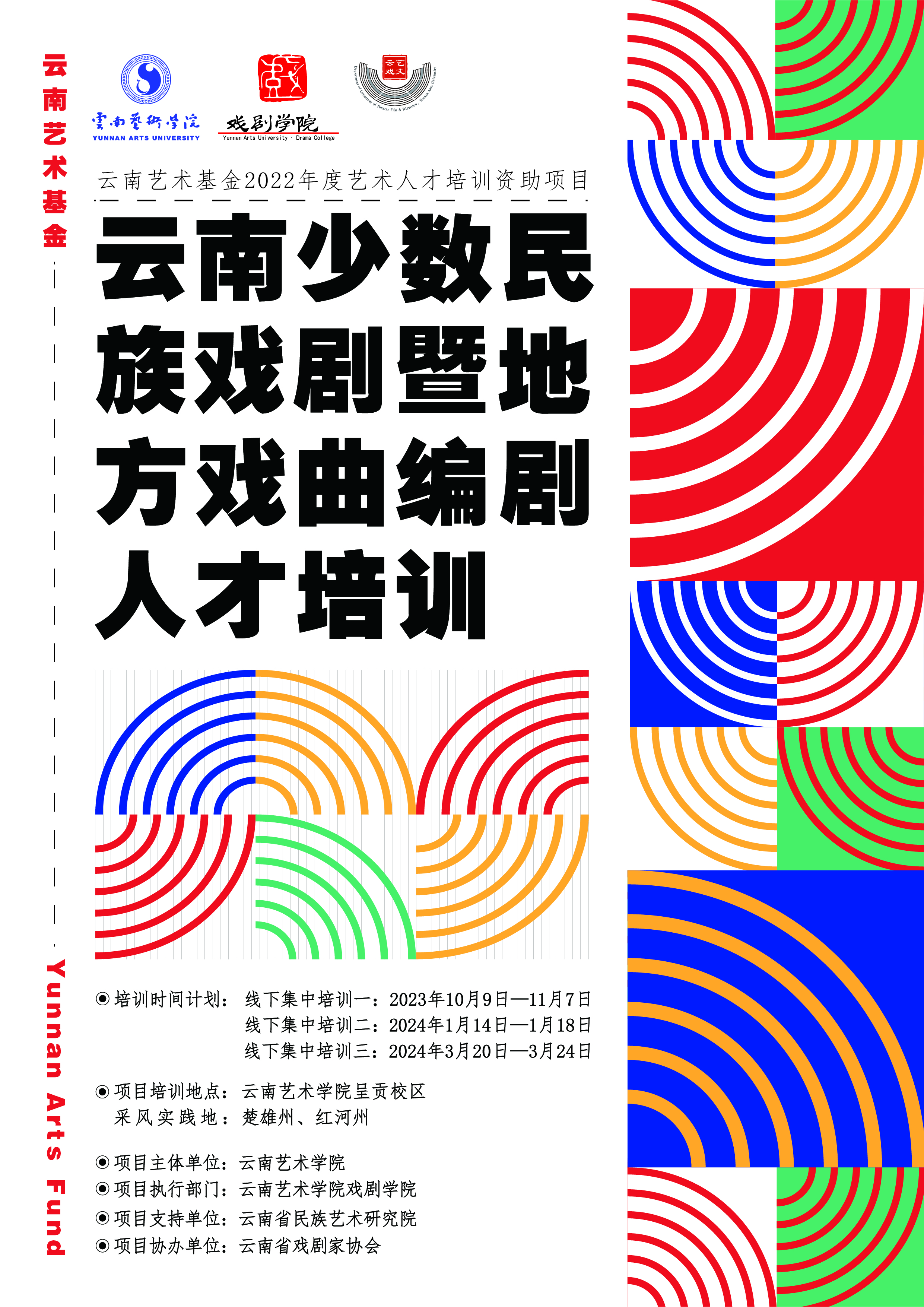 本项目主要面向云南省内选拔从事少数民族戏剧和地方戏曲创作的编剧人才,或致力于从事少数民族戏剧和地方戏曲、戏剧创作的优秀中青年文艺人才进行集中培训。项目以铸牢中华民族共同体意识为己任,举旗帜、聚民心、育新人、兴文化、展形象,以培育德艺双馨、高水平艺术人才为目标,为提高云南戏剧戏曲的整体创作质量发挥积极作用。项目自2023年10月开班,至2024年3月结束。