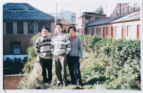 青砖楼前(左起:杨祝飞、颜峻、朱贵荣)