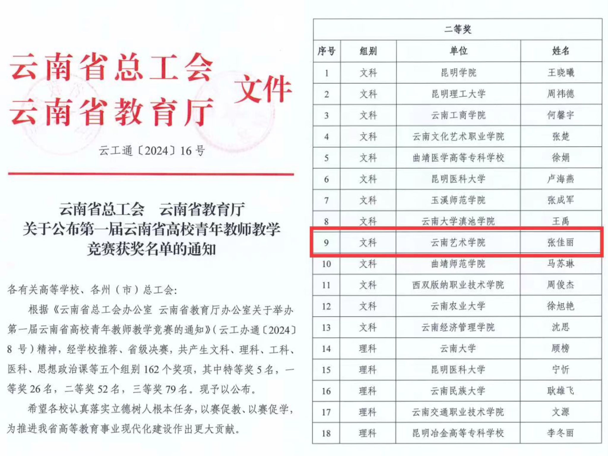 近日,云南省总工会、云南省教育厅公布了第一届云南省高校青年教师教学竞赛获奖名单,舞蹈学院张佳丽老师荣获教学竞赛文科类二等奖。