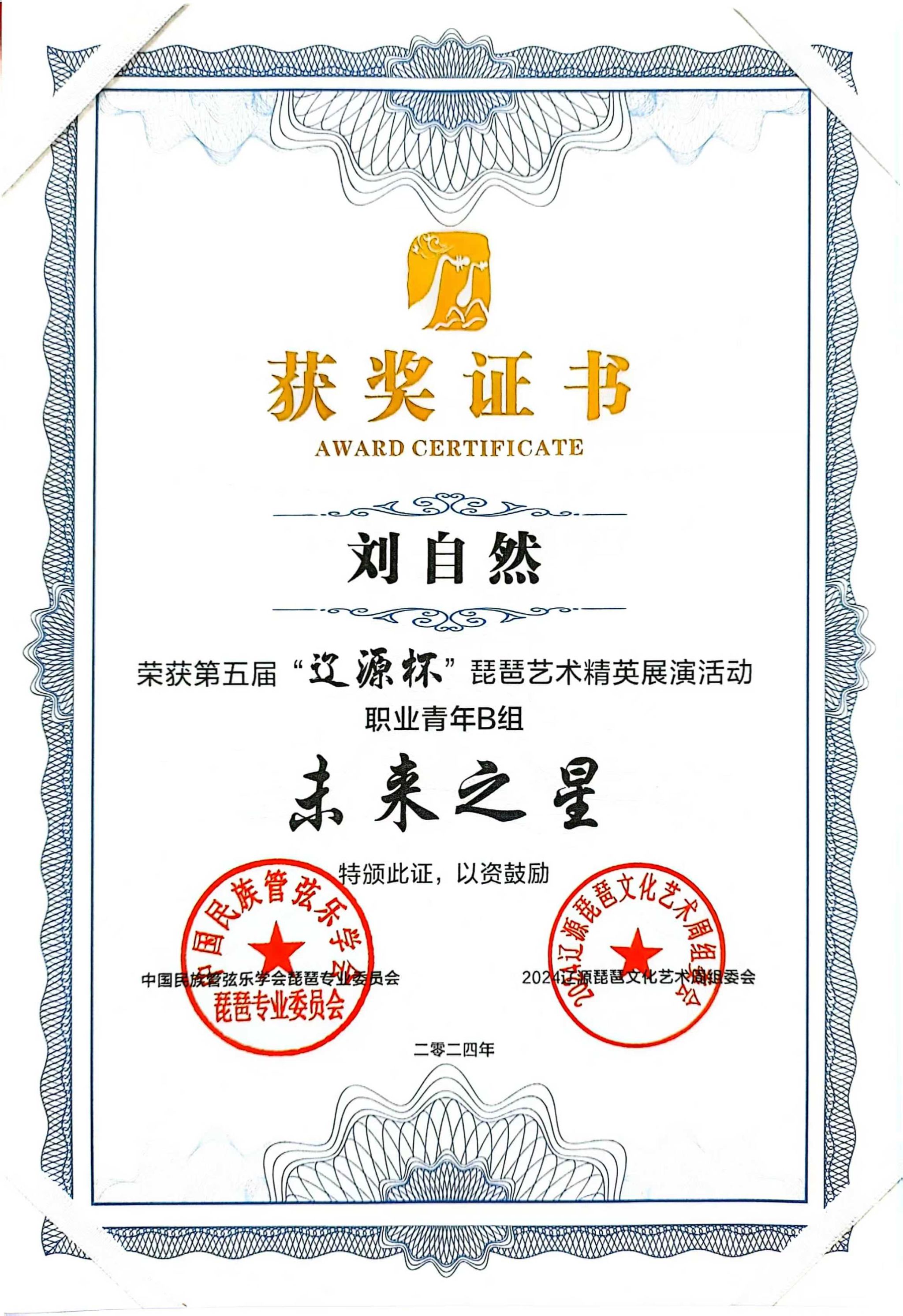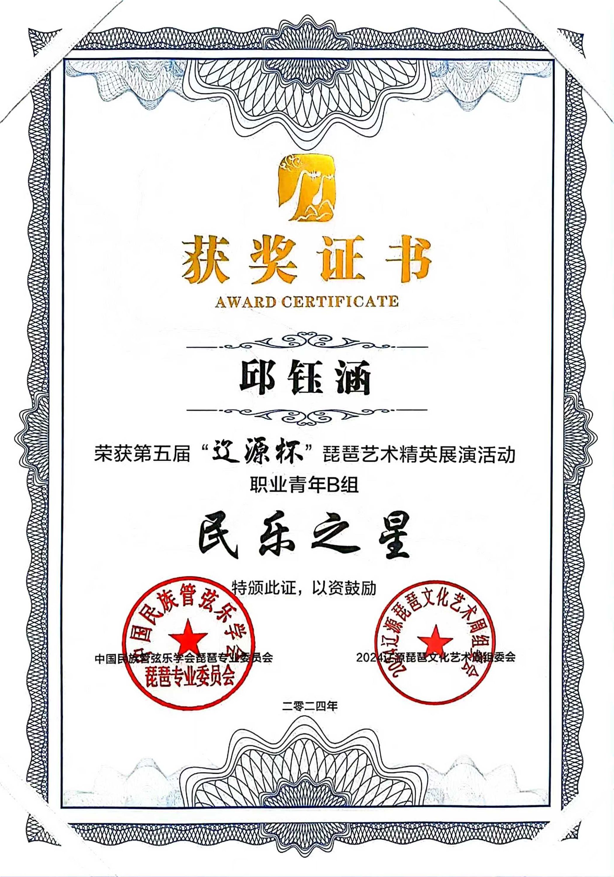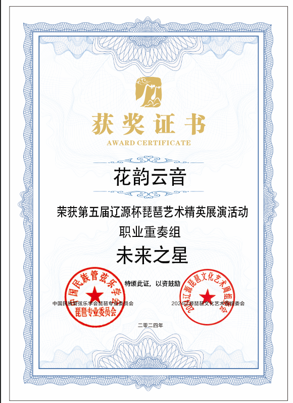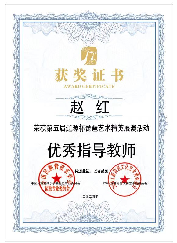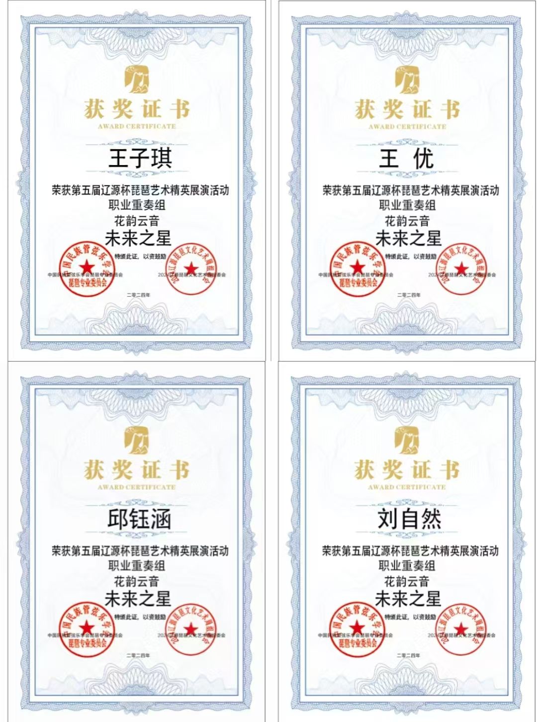 2024年8月1日至5日,由中共辽源市委、辽源市人民政府、中国民族管弦乐学会琵琶专业委员会、吉林省民族管弦乐学会主办的第五届“辽源杯”琵琶艺术精英展演活动在吉林省辽源市举行。音乐学院研究生班王子琪获职业成年组“民乐之星”,2023级国乐班邱钰涵获职业青年B组“民乐之星”,2020级国乐班王优、2023级国乐班刘自然分别获职业青年B组“未来之星”,由王子琪、王优、邱钰涵、刘自然组成的“花韵云音”获职业重奏组“未来之星”。国乐系教师赵红获“优秀指导教师”。
