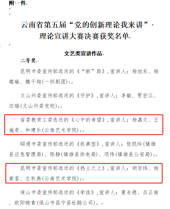 为持续深入学习贯彻习近平新时代中国特色社会主义思想和习近平总书记考察云南重要讲话精神,进一步推动党的创新理论大众化,省委宣传部、省委网信办、省委省直机关工委、省委教育工委、省国资委党委联合举办了云南省第五届“党的创新理论我来讲”理论宣讲大赛。买球投注官方网站积极组织开展活动,涌现出一批师生宣讲骨干。戏剧学院师生杨嘉文、王施奇、和建乐创作的作品《心中的希望》由省委教育工委选送,戏剧学院师生胡京纬、杨紫荃、左秋燕创作的作品《热土之上》由昆明市委宣传部选送,均荣获文艺类宣讲作品二等奖。