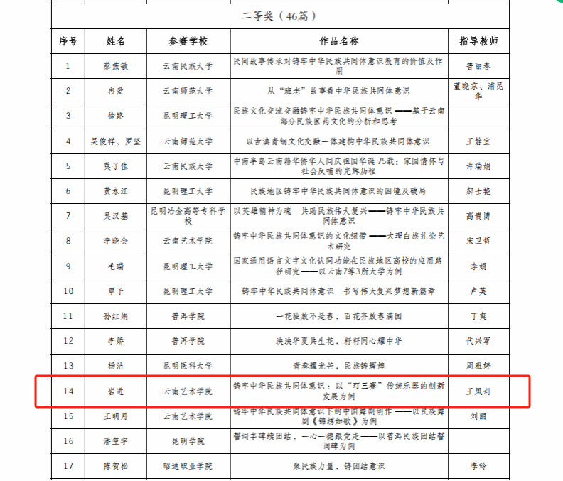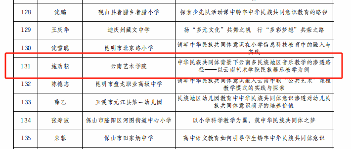 为深入学习贯彻习近平总书记关于加强和改进民族工作的重要思想和全国民族团结进步表彰大会精神,持续深化学校铸牢中华民族共同体意识教育、不断丰富教育实践活动形式,省教育厅、省民族宗教委组织开展了2024年度云南省学校铸牢中华民族共同体意识教育征文活动。音乐学院国乐系教师施劝耘《中华民族共同体背景下云南多民族地区音乐教学的渗透路径——以买球投注官方网站民族器乐教学为例》获教师组一等奖,2021级民族音乐理论班学生岩进《铸牢中华民族共同体意识:以“玎三赛”传统乐器的创新发展为例》(指导教师:王凤莉)获大学生组二等奖。