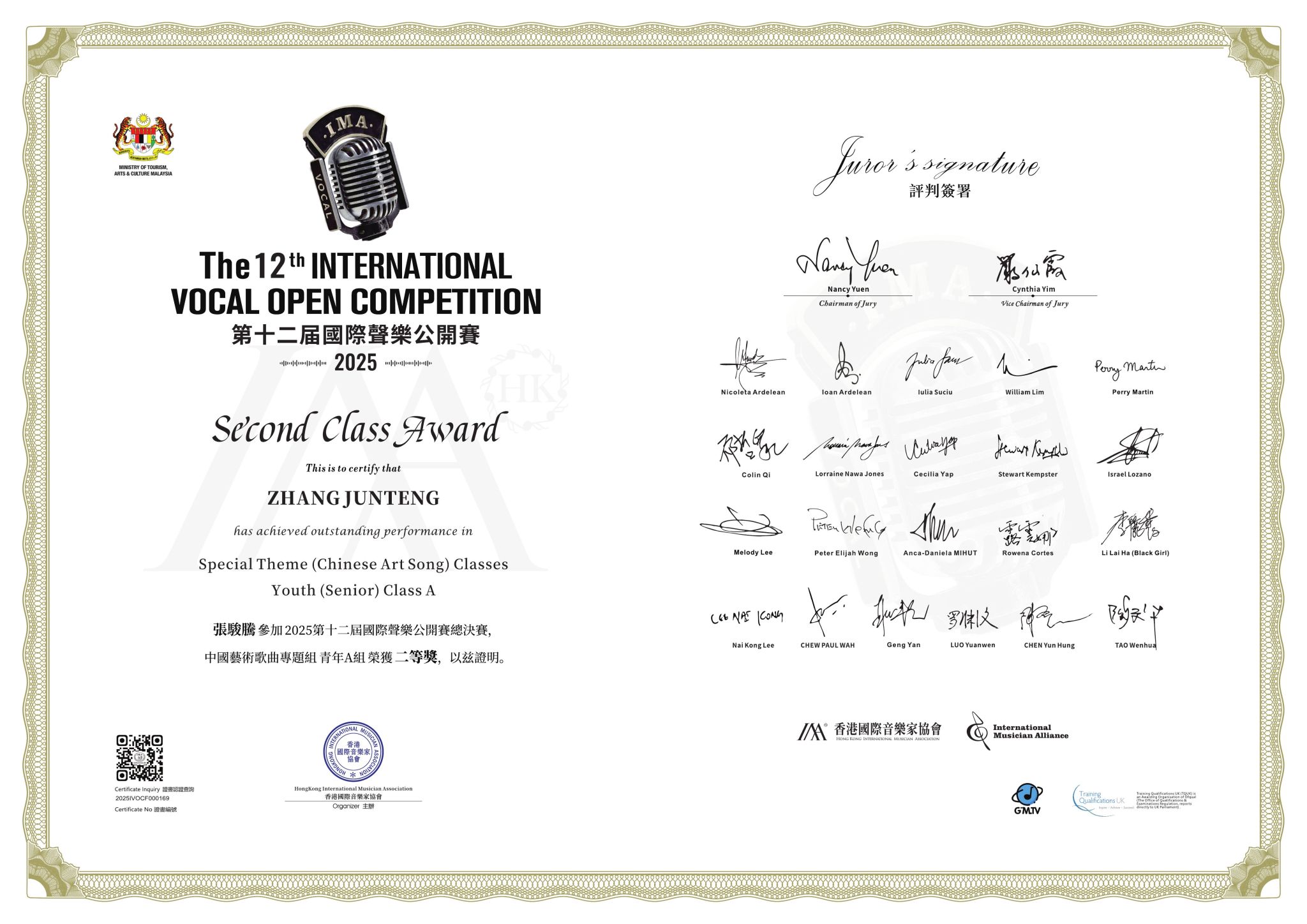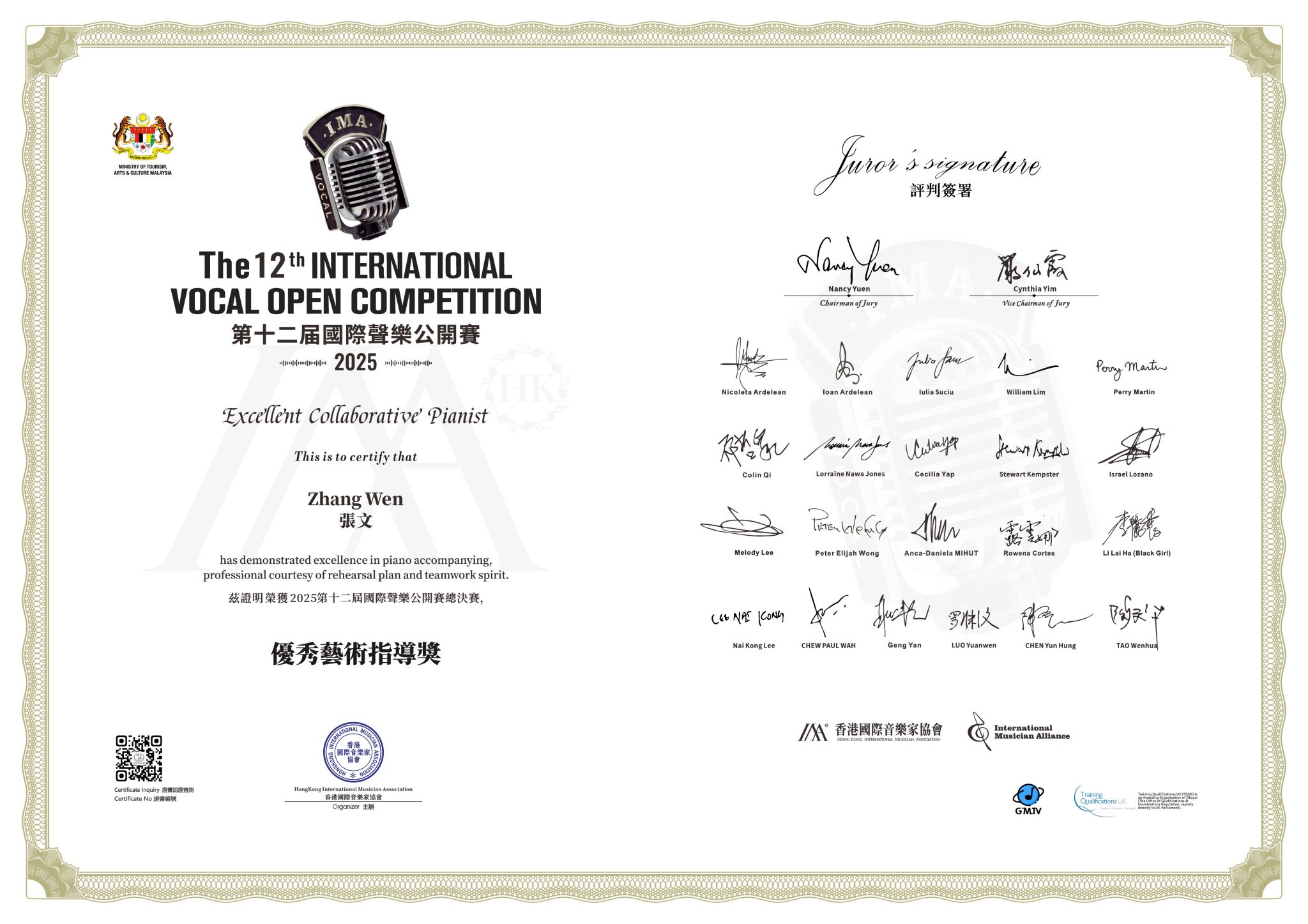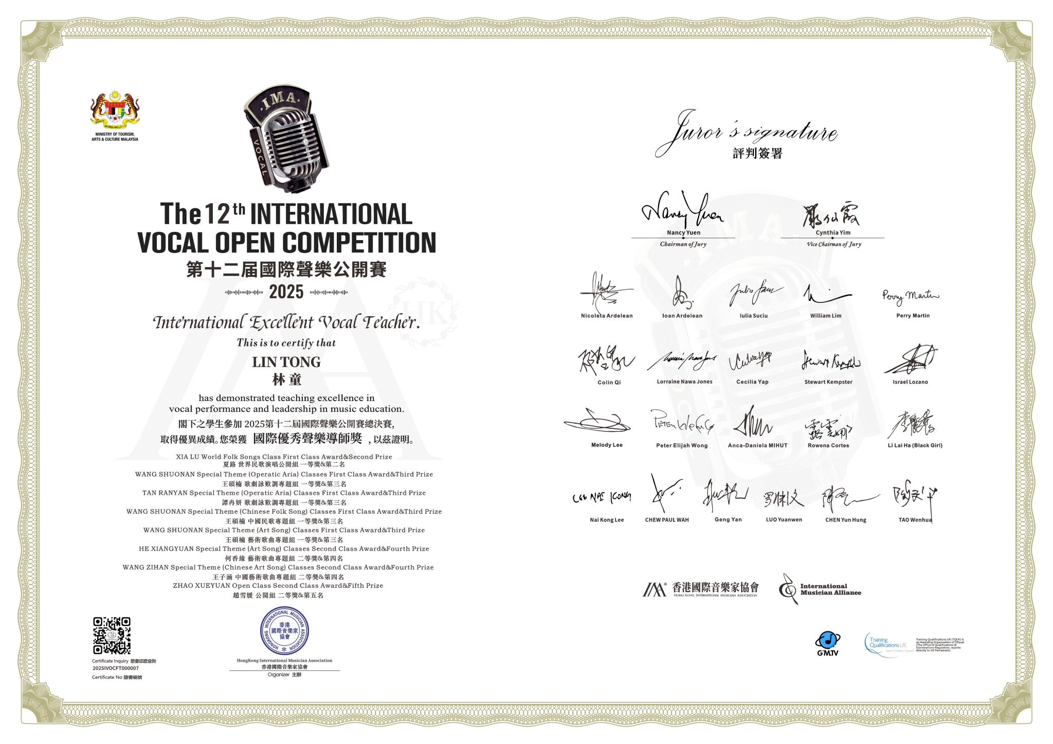 2025年1月17-21日,2025年第十二届国际声乐公开赛全球总决赛在马来西亚·吉隆坡举行。买球投注官方网站音乐学院声歌系师生喜获佳绩:硕士研究生夏路荣获“世界民歌演唱公开组一等奖”,硕士研究生谭冉研荣获歌剧咏叹调专题组青年A组一等奖,硕士研究生何香缘获得艺术歌曲专题组青年A组二等奖,硕士研究生张骏腾获得中国艺术歌曲专题组青年A组二等奖,本科生王子涵获得中国艺术歌曲专题组青年A组二等奖,硕士研究生何香缘获得歌剧咏叹调专题组青年A组三等奖,硕士研究生李蕊彤获得歌剧咏叹调专题组青年B组三等奖 ;林童教授荣获“国际优秀声乐导师奖”,青年教师张文荣获“优秀艺术指导奖”。