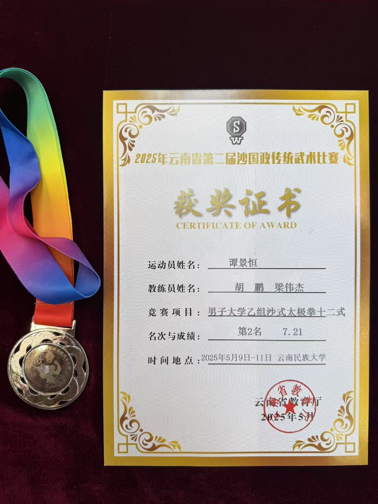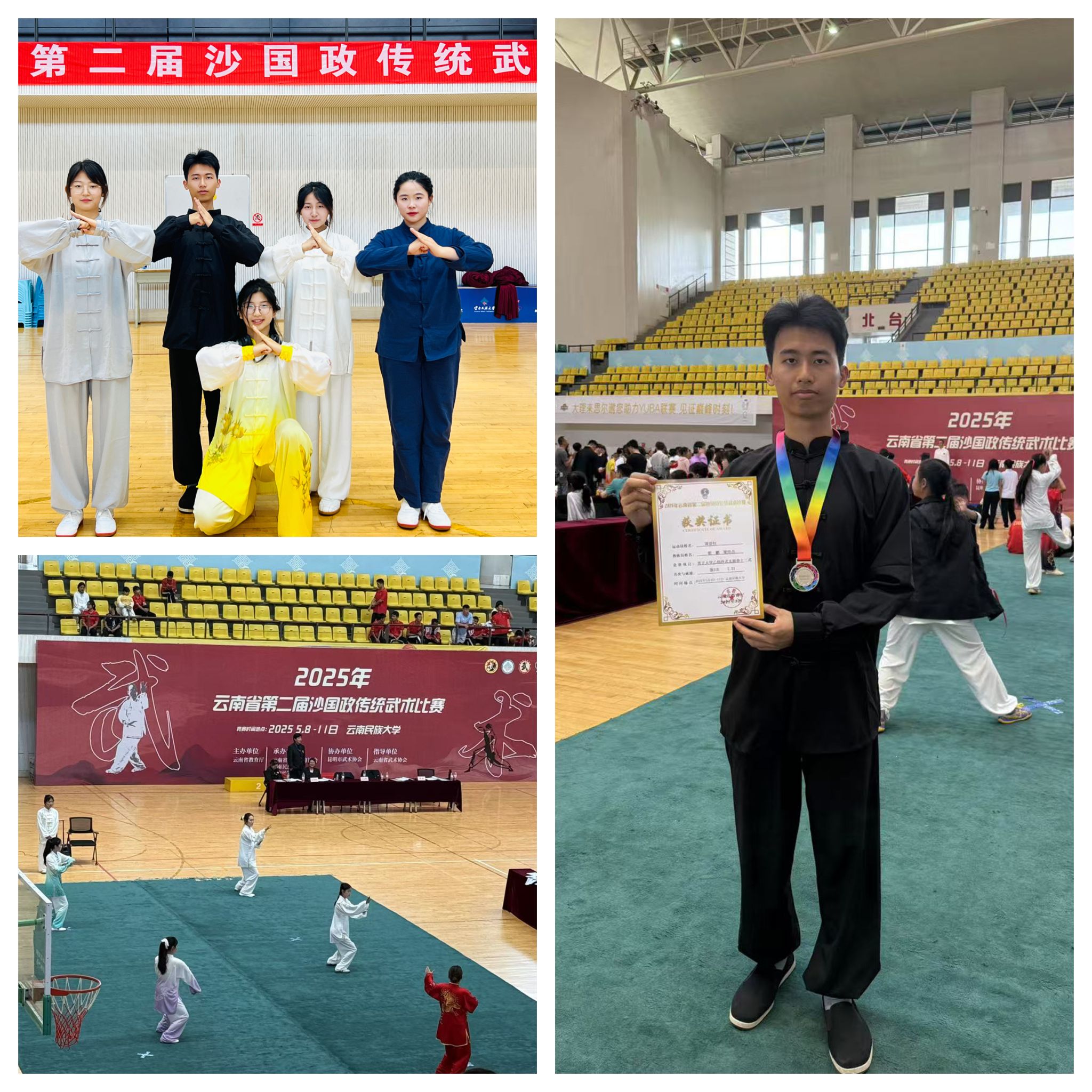 2025年5月9日至11日,云南省教育厅主办的“云南省第二届沙国政传统武术比赛”在云南民族大学举行,本次比赛汇集了云南省80家单位共计716名队员参赛。买球学生武术代表队在学校领导的关心和支持下,由体育教学部石刚老师领队,胡鹏、梁伟杰两位老师带队参赛。比赛期间,买球队员沉着冷静,不惧对手,其中谭景恒同学在沙式太极拳12式项目中获得亚军一项,其他队员分别获第四名、第五名、第六名各一项。