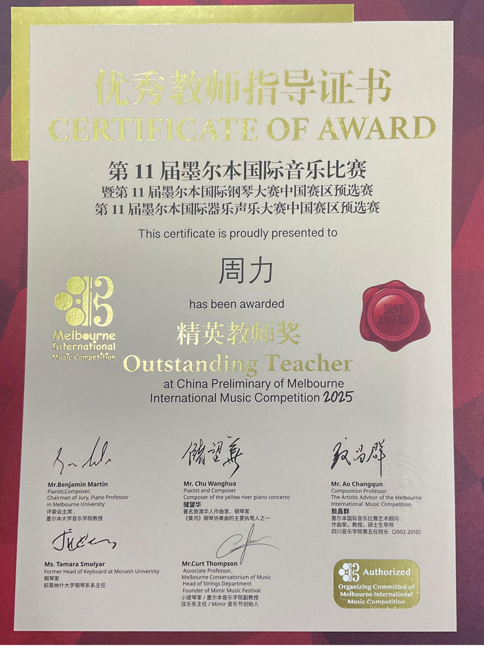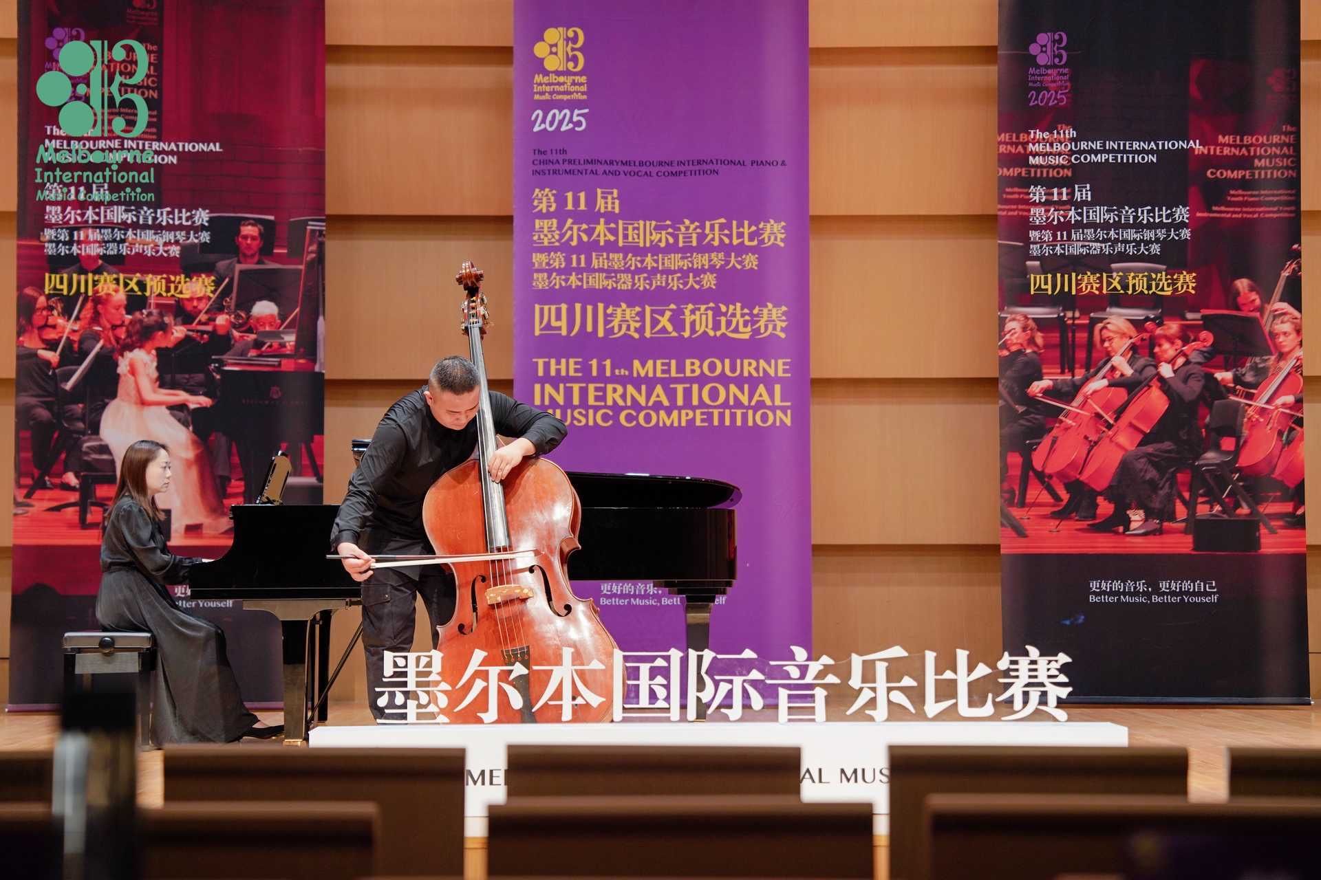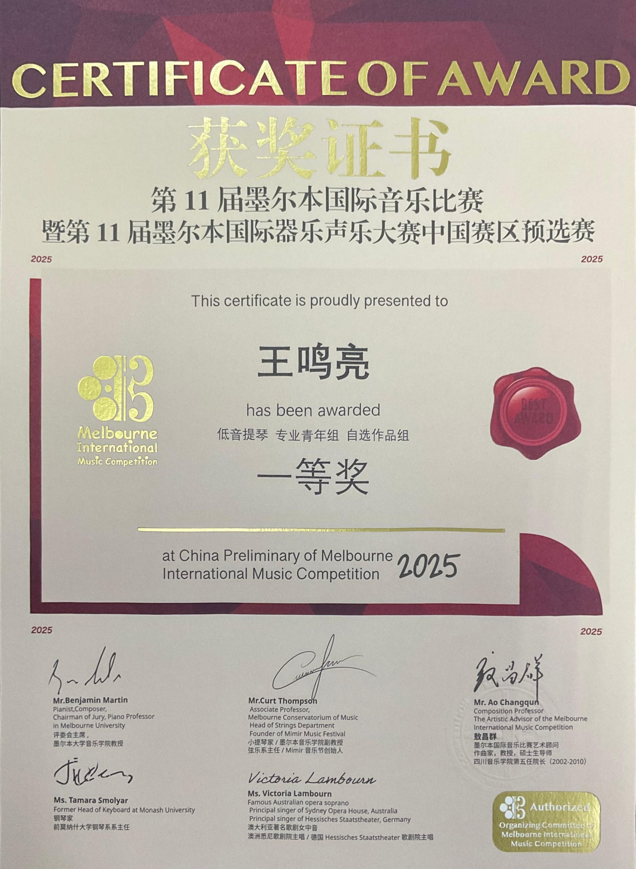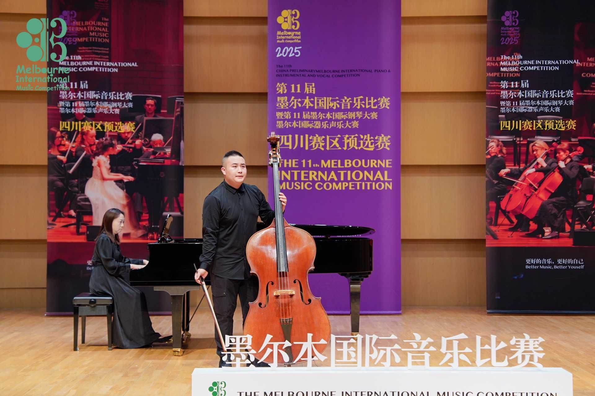 2025年4月26日至5月1日,在成都城市音乐厅举办的第11届墨尔本国际音乐比赛暨第11届墨尔本国际器乐声乐大赛中国赛区预选赛中,音乐学院2022级管弦打击乐演奏班学生王鸣亮(2025年获评音乐学院第五届“拔尖创新人才”)获低音提琴专业青年组自选作品组一等奖,并获得前往墨尔本莫纳什大学音乐厅参加全球决赛和研学资格。指导教师周力副教授获精英教师奖。