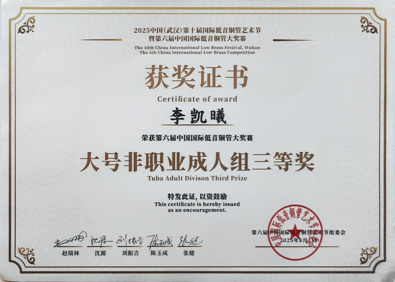 2025年第六届中国(国际)低音铜管大奖赛是第十届中国(武汉)国际低音铜管艺术节的核心赛事,于2025年7月31日至8月1日在武汉东西湖区临空港艺术中心及临空港大剧院举行。该赛事由中国乐器协会管乐专业委员会主办,武汉临空港保利大剧院有限公司协办,中国音协管乐学会低音铜管专业委员会指导,旨在推动低音铜管艺术发展并促进国际文化交流。买球投注官方网站音乐学院管弦系2022级管弦打击乐演奏班学生李凯曦进入决赛,获得非职业成人组三等奖(指导教师:赵华)。
