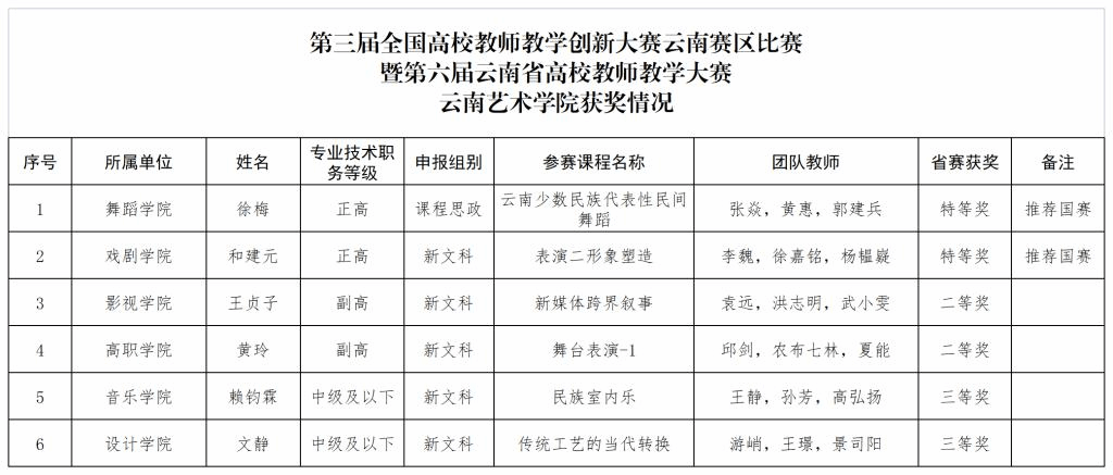 本次大赛由云南省教育厅主办,云南师范大学承办,北京世纪超星信息技术发展有限责任公司提供技术支持。2023年2月买球启动校赛以来,学校领导高度重视,教学单位积极配合,教务处、人事处协同认真开展大赛相关工作,邀请全国知名专家围绕教学创新主题,开展教学创新设计、获奖经验分享等系列培训活动。经过两轮比赛,徐梅老师、和建元老师、黄玲老师、王贞子老师、文静老师、赖钧霖老师获得校赛一等奖并入围省级比赛。