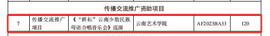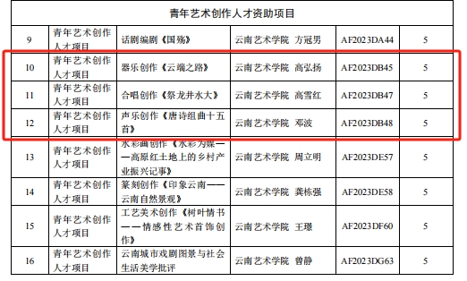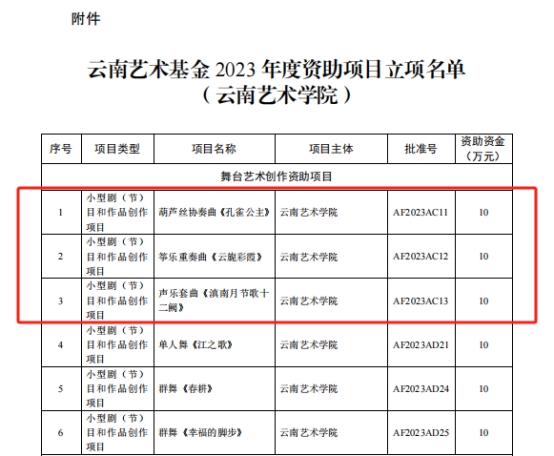 云南艺术基金2023年度资助项目经申报、专家评审、会议研究,公示无异议后,云南省文化和旅游厅决定对1项重大项目,29项舞台艺术创作项目,6项传播交流推广项目,6项艺术人才培训项目,24项青年艺术创作人才项目予以立项资助。买球投注官方网站音乐学院共获得8项立项,名单如下: