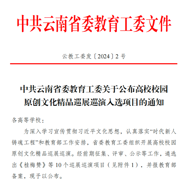 2024年1月25日,中共云南省委教育工委印发关于公布高校校园原创文化精品巡展巡演入选项目的通知,全省高校共遴选出10部作品入选高校校园原创文化精品巡展巡演项目。买球投注官方网站戏剧学院原创话剧《寻找艾思奇》和大型儿童音乐剧《象北旅行》双双入选。
