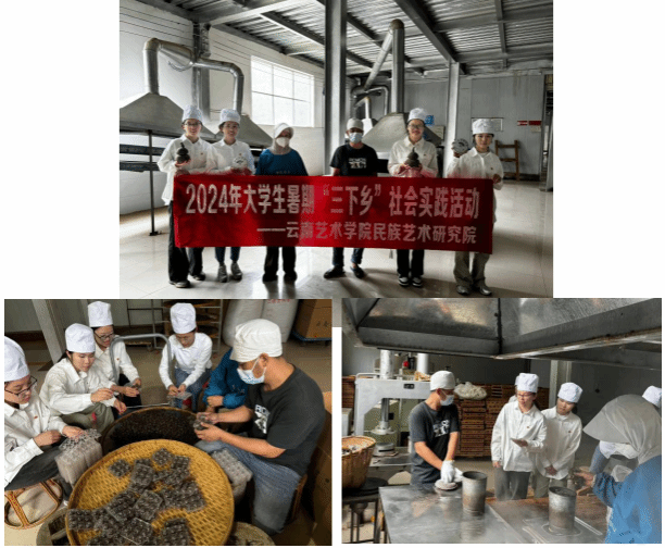 调研团首先对墨江老牌茶场——露水茶场、他郎茶场和新兴茶场——“水之灵”开展了调研。在露水茶场,调研团深入茶场工作环境,了解了当前该茶场的经营模式,并与茶农并肩劳作,参与茶叶采摘、封装等过程。在他郎茶场,调研团参与压茶饼,访谈须立贡茶第五代非遗传承人。调研团了解到,当前茶场的难点在于技术人才欠缺,工人职业化转型难等问题,并且随着新兴茶场品牌的出现,老牌茶场在竞争力、管理上也遇到一些实际困难,调研团和访谈人深度讨论了当前农旅结合是否能达到转型,以及坚守传统与创新结合等问题。