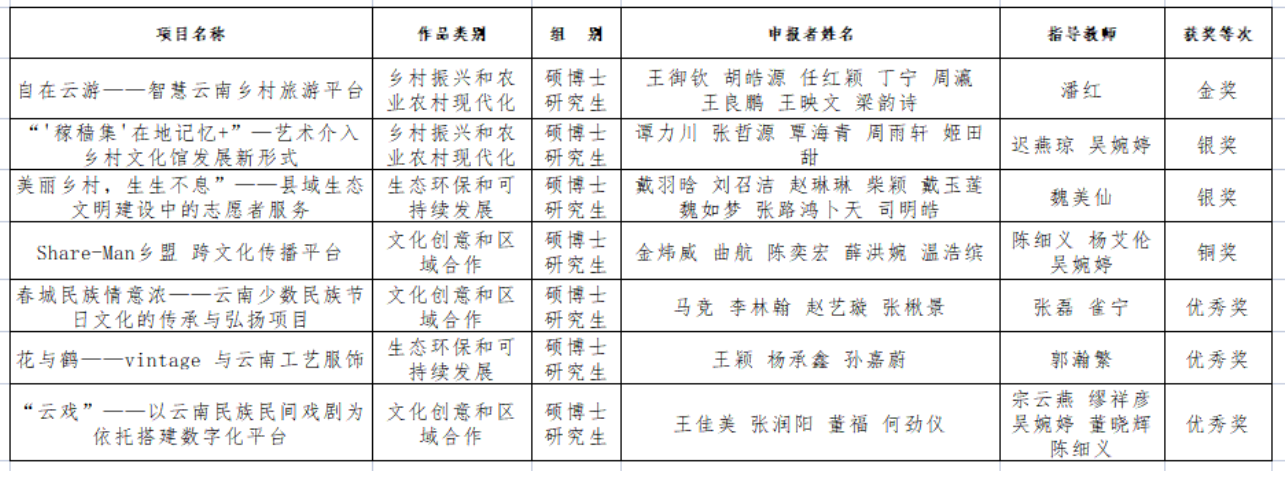 由买球投注官方网站校团委、教务处、人事处、科技处、学生工作部(处)、研究生处联合举办的买球投注官方网站2022年度“挑战杯”大学生创业计划竞赛,经各学院遴选推荐、资格审查、校内外专家盲审、各参赛队现场答辩终审等校内比赛环节,组委会从上报校赛的 270 件作品中评选出校级金奖作品 15 件、银奖作品 20 件、铜奖作品 18 件、优秀奖作品 27 件。民族艺术研究院学生在买球投注官方网站2022年“挑战杯”大学生创业计划竞赛中斩获佳绩,其中民族艺术研究院王御钦同学团队申报的《自在云游——智慧云南乡村旅游平台》项目获得校赛金奖;谭力川和戴羽晗两名同学各自的团队获得校赛银奖;金炜威同学团队申报的《Share-Man乡盟跨文化传播平台》获铜奖。另有优秀奖团队3个,分别由马竞、王颖、王佳美同学及其团队获得。